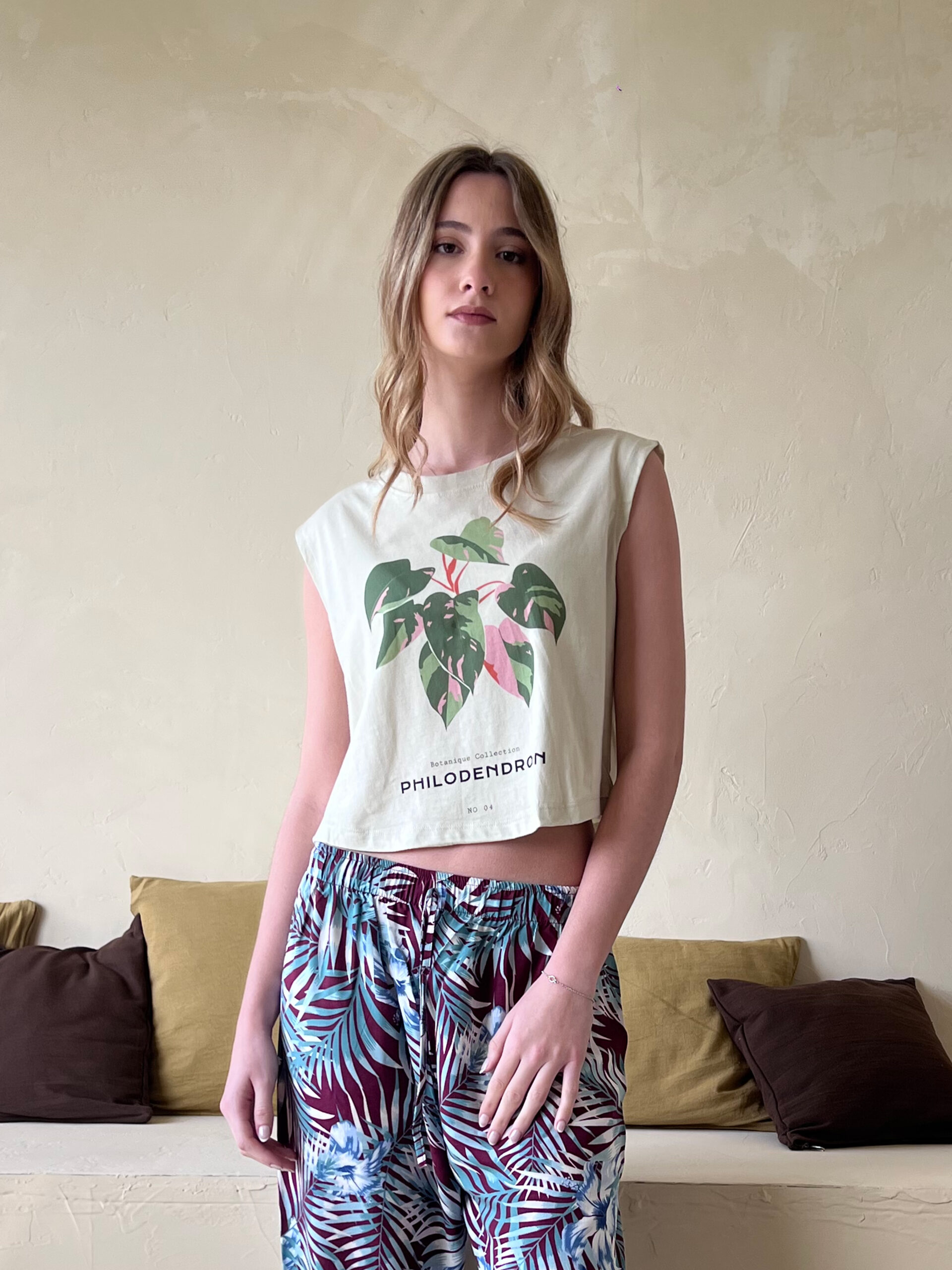 Musculosa ancha con cuello redondo en ribb y bajo redondeado. Detalle de estampa en el delantero.