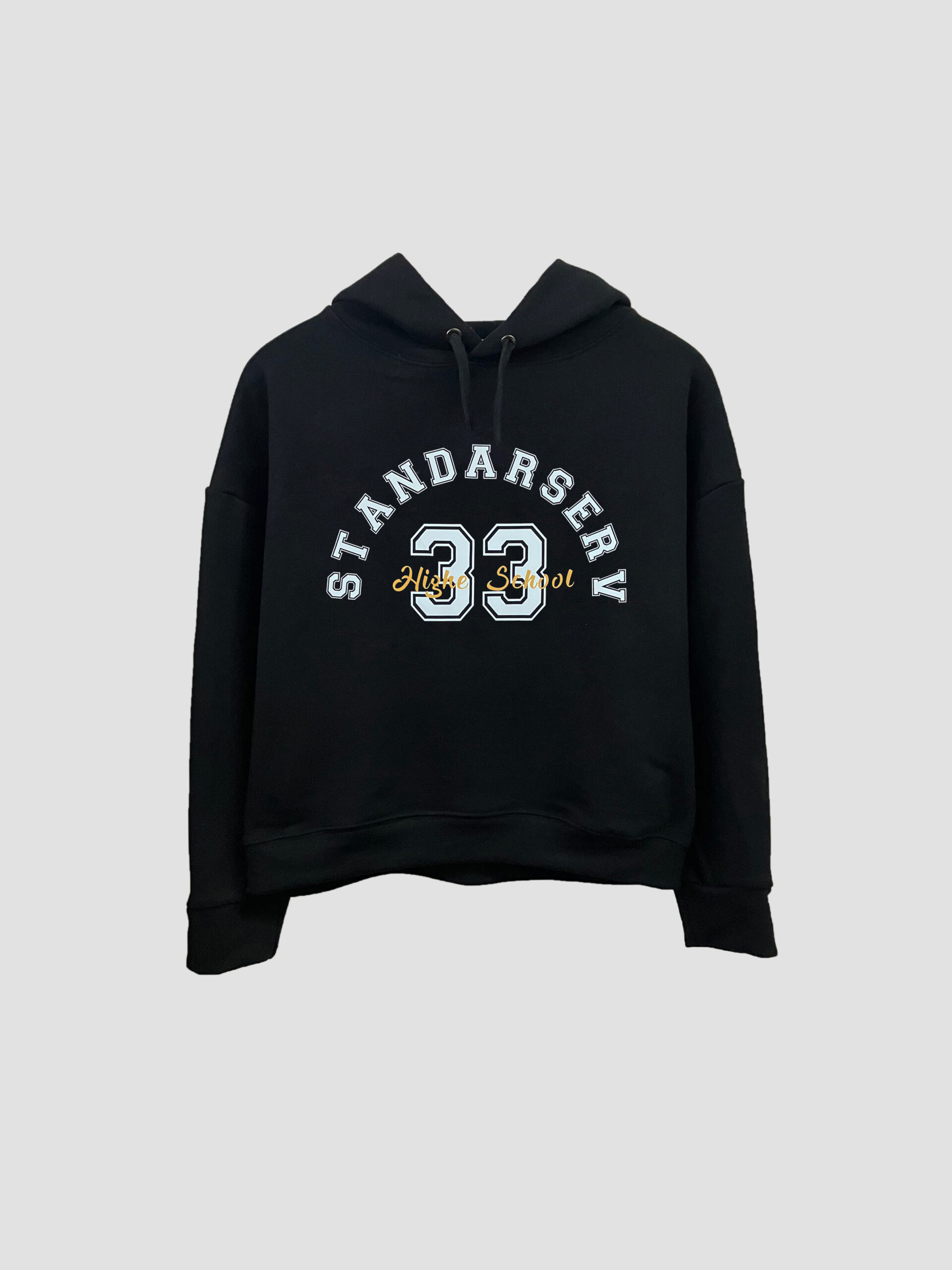 Buzo básico con capucha, hombros caídos y cordón de ajuste. Detalle de estampa en el delantero.