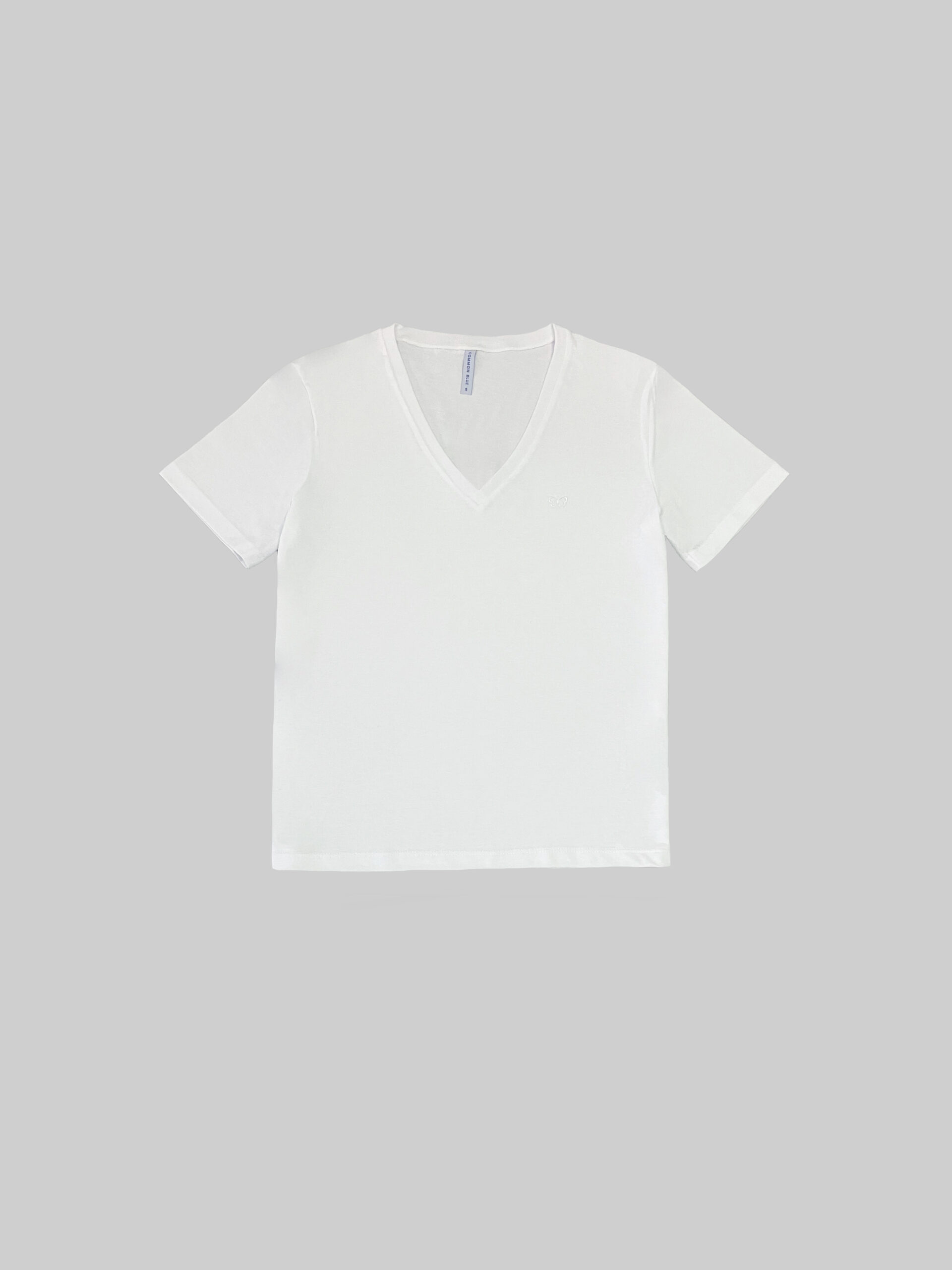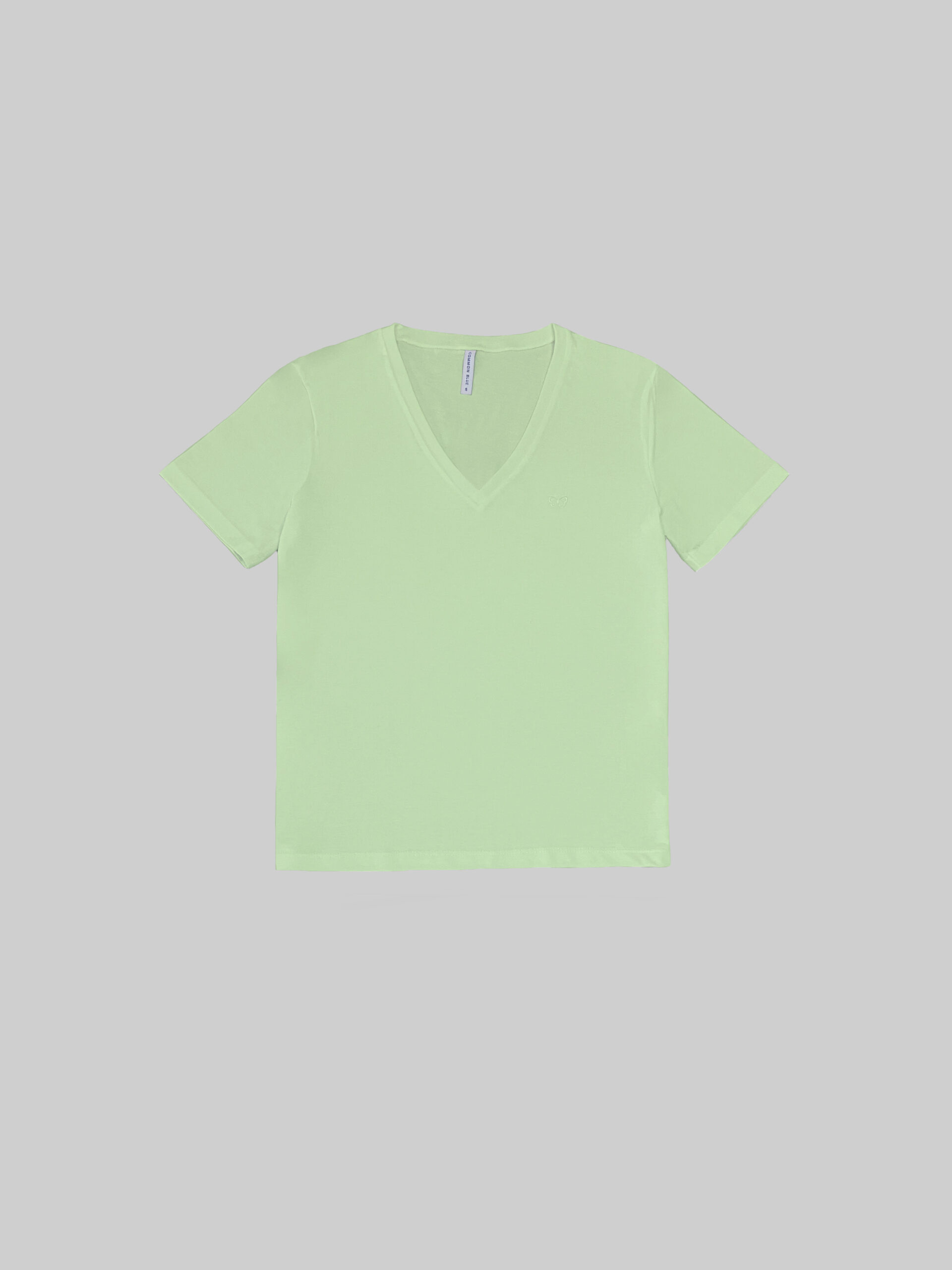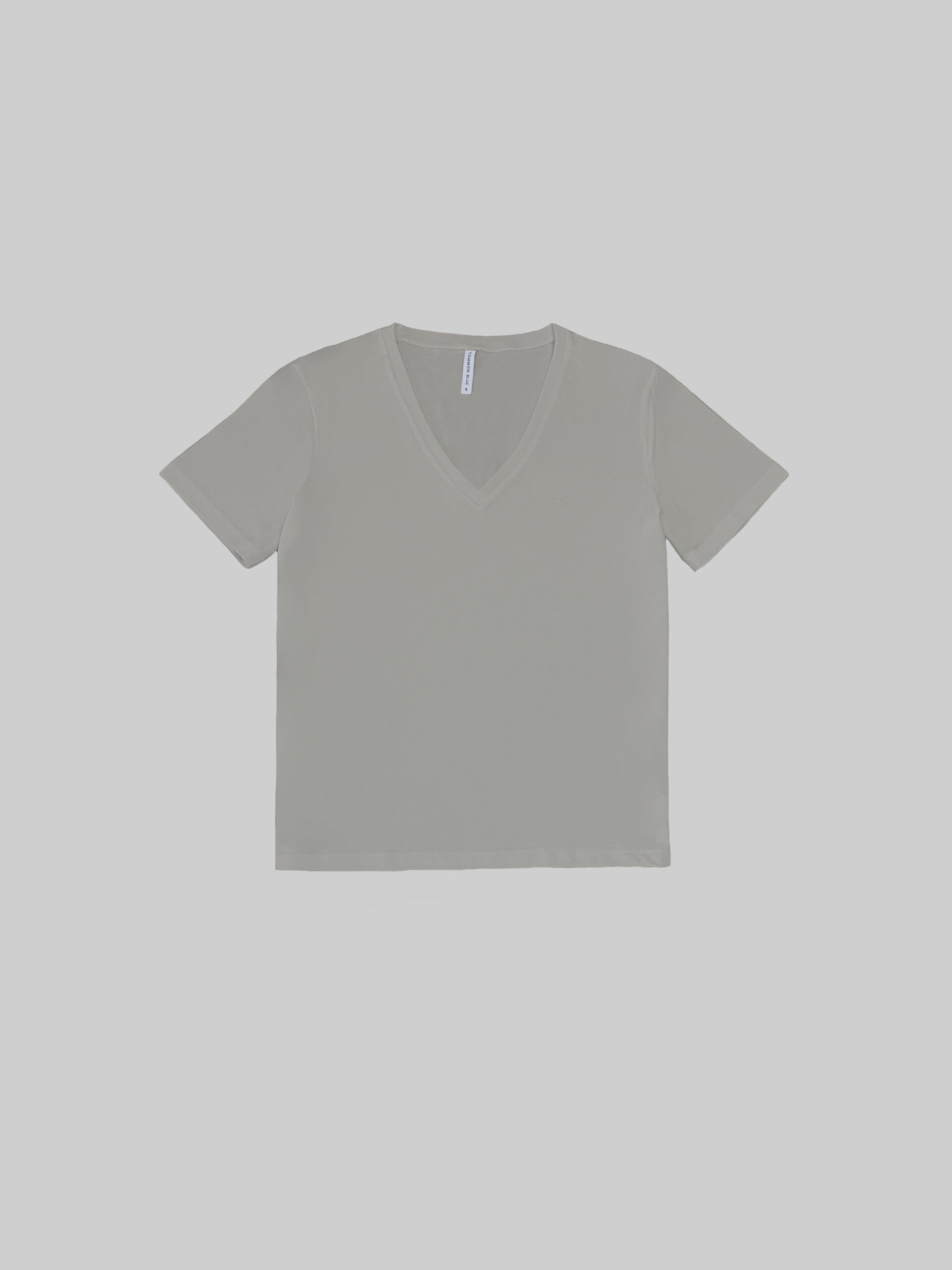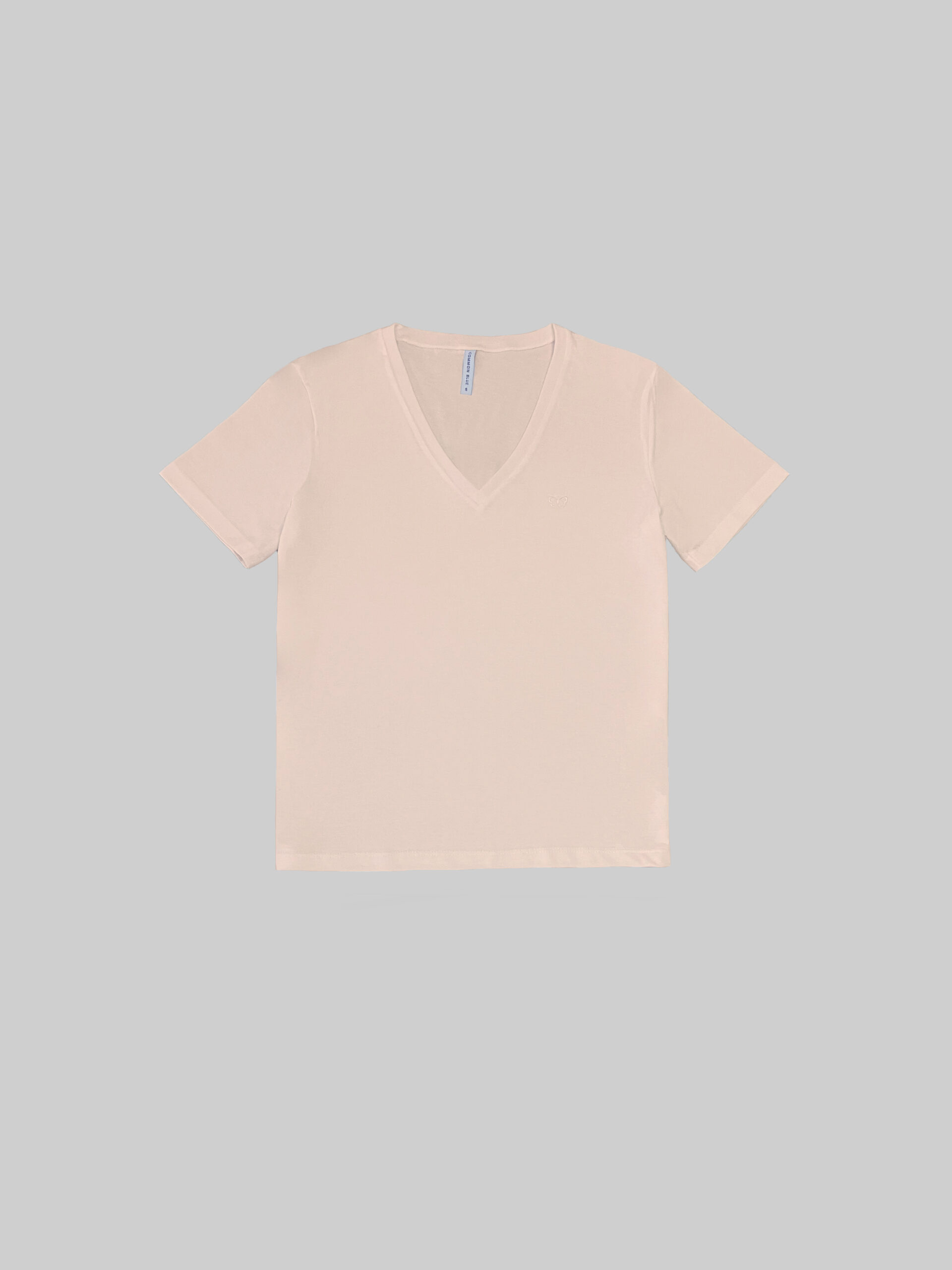 Remera manga corta con escote V en ribb. Bajo recto y largo hasta la cadera.