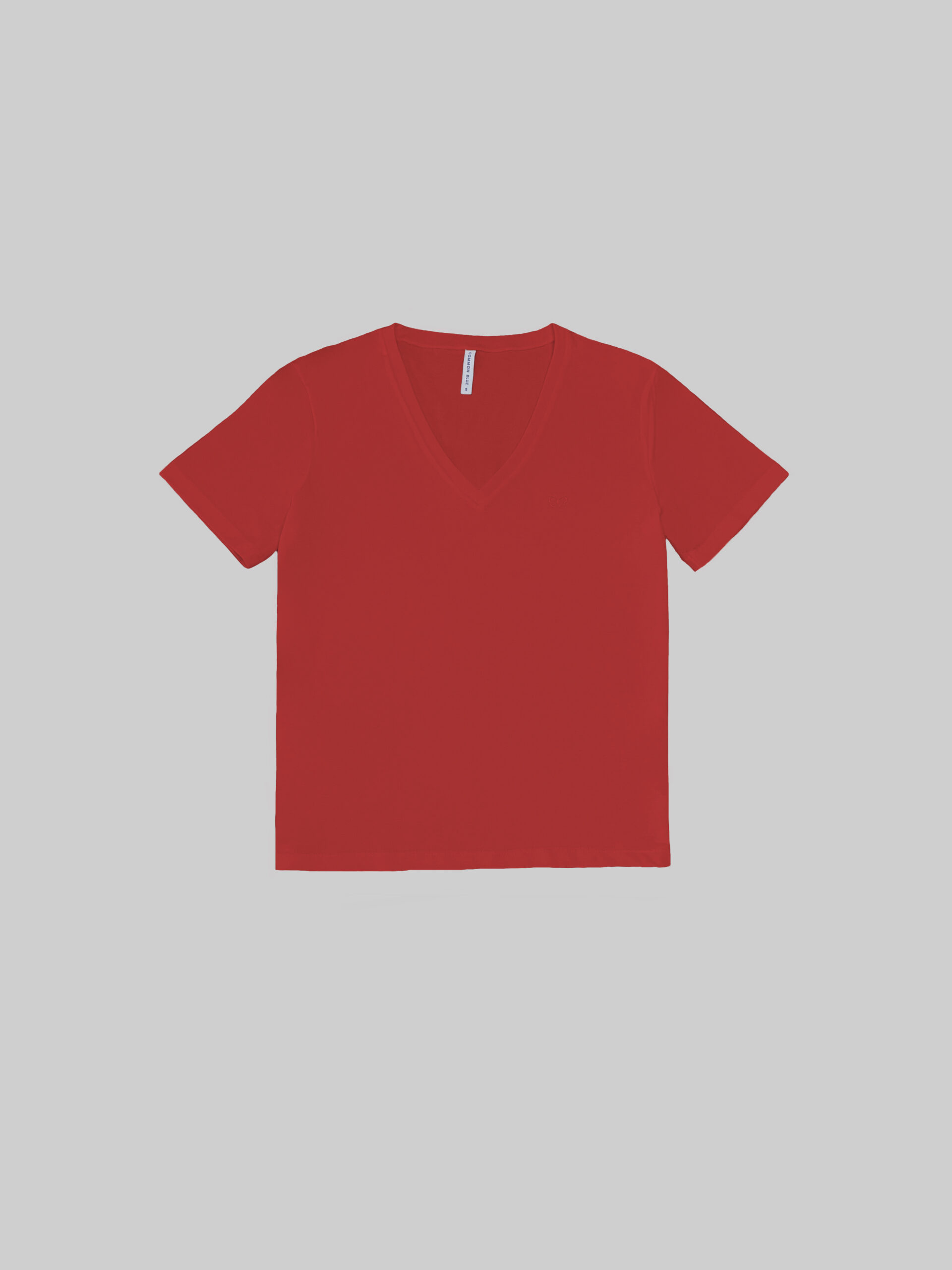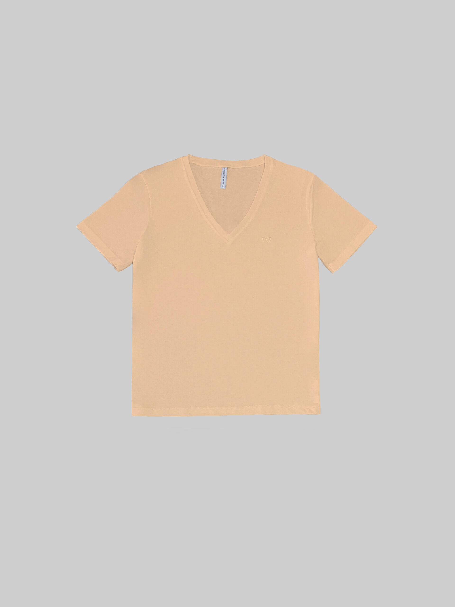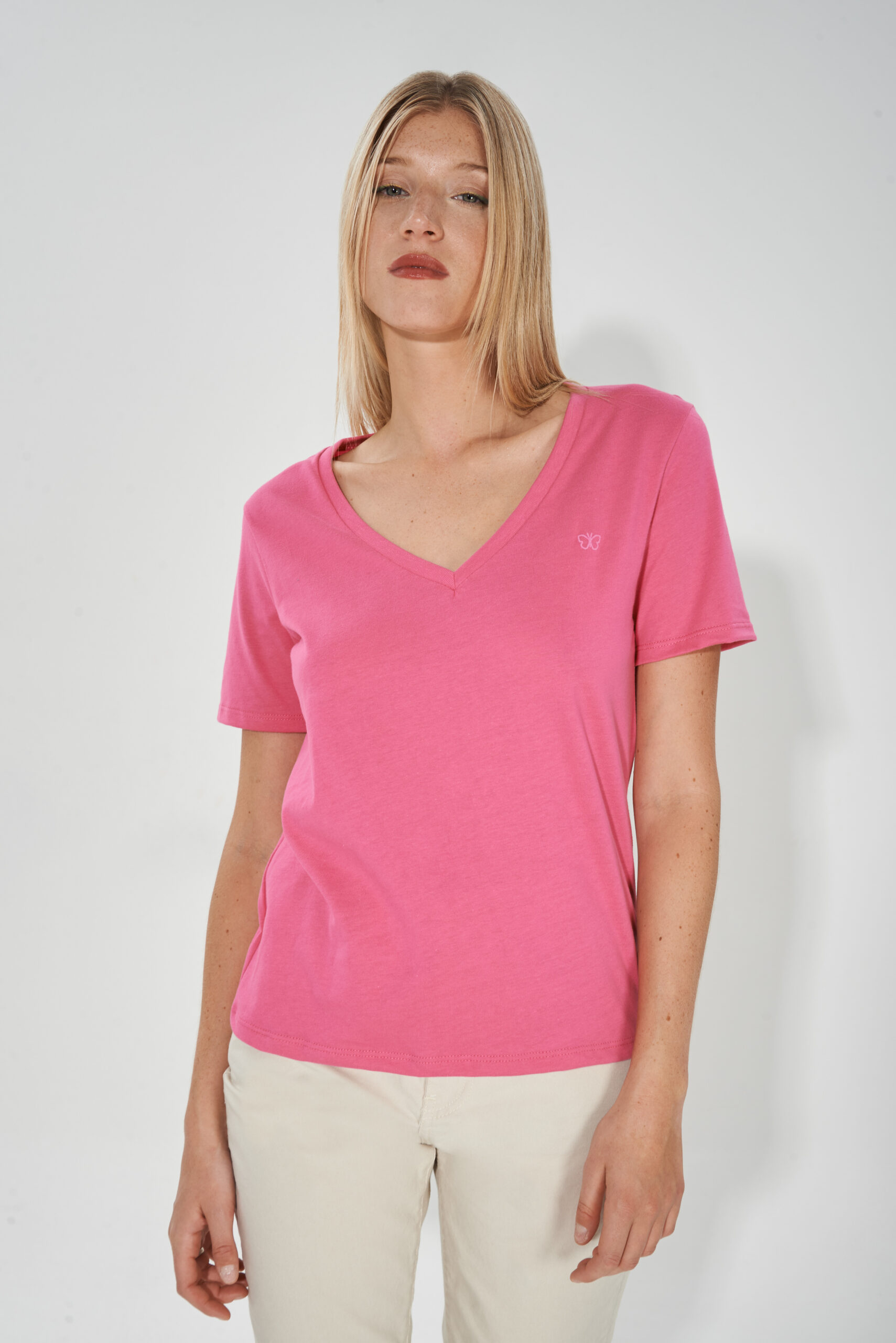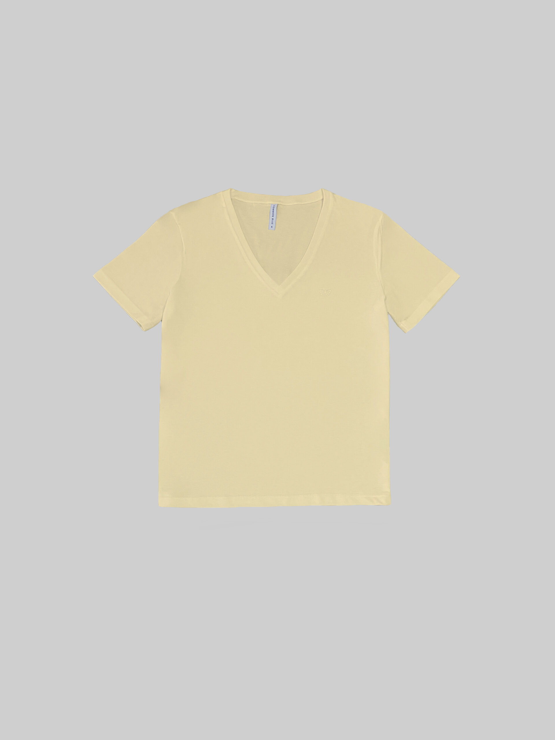 Remera manga corta con escote V en ribb. Bajo recto y largo hasta la cadera.