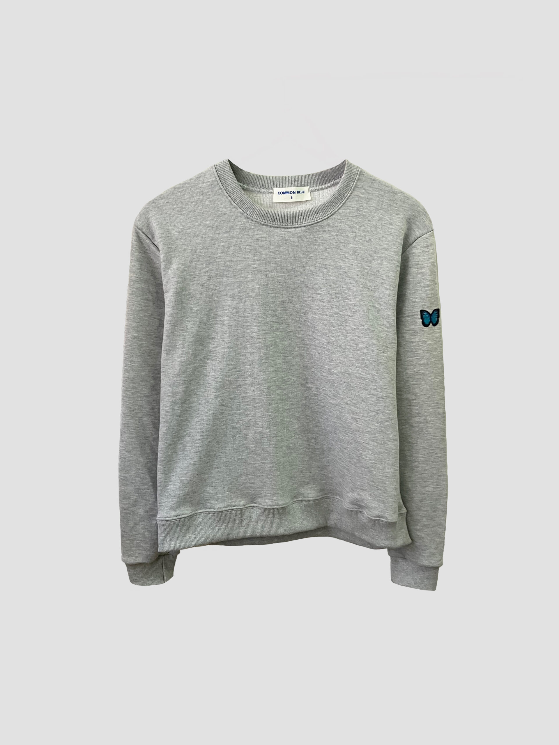 Buzo básico manga larga con cuello, bajo y puños en morley. Detalle de parche en la manga.