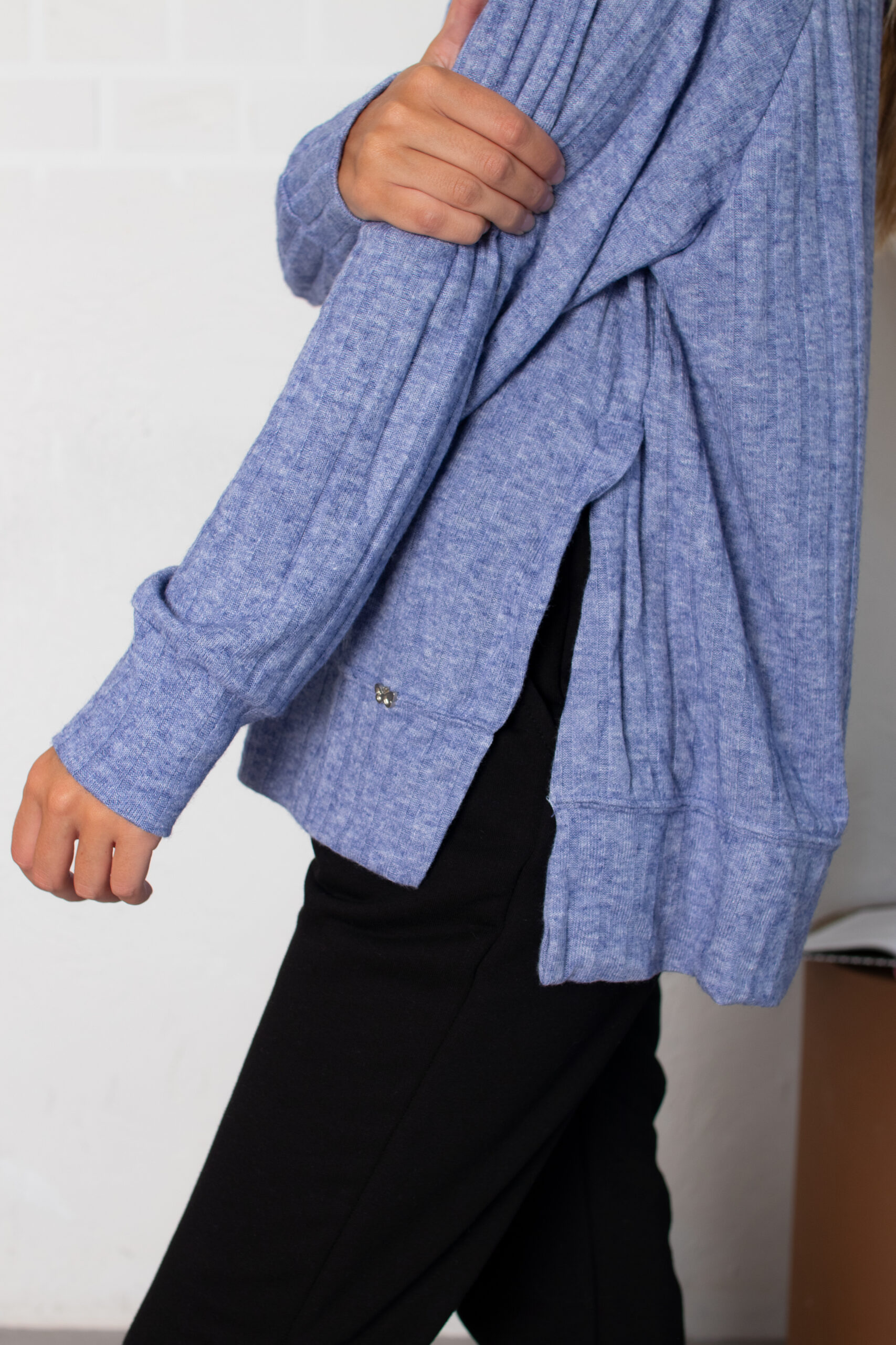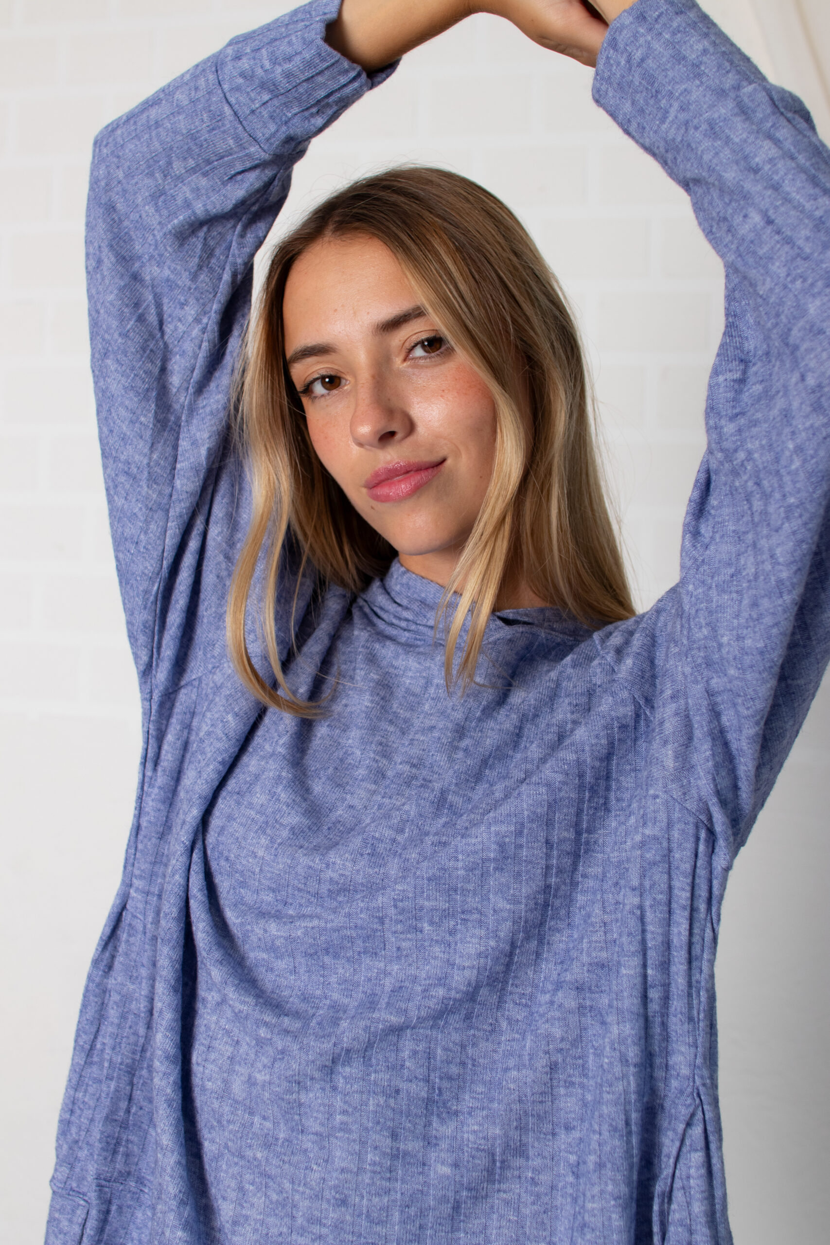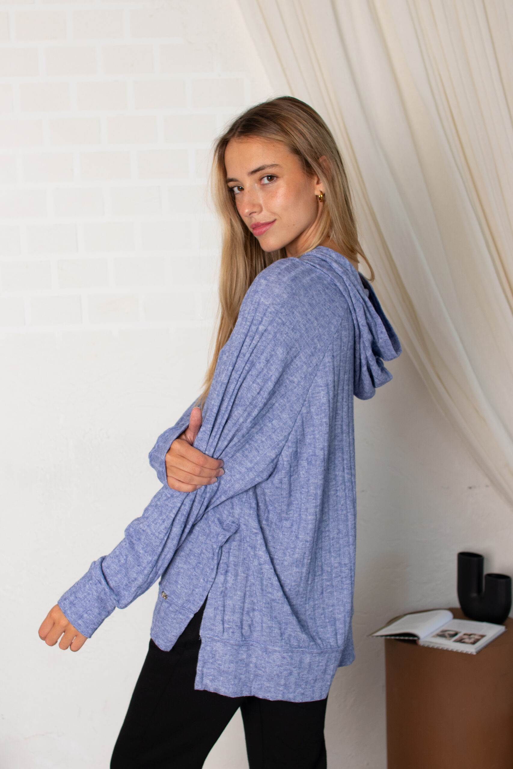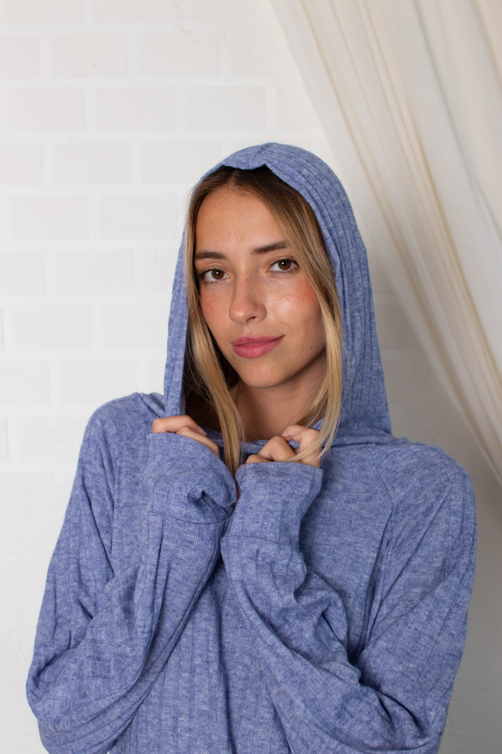 Buzo holgado con capucha y mangas ranglan. Detalle de recorte al bies en el bajo delantero.