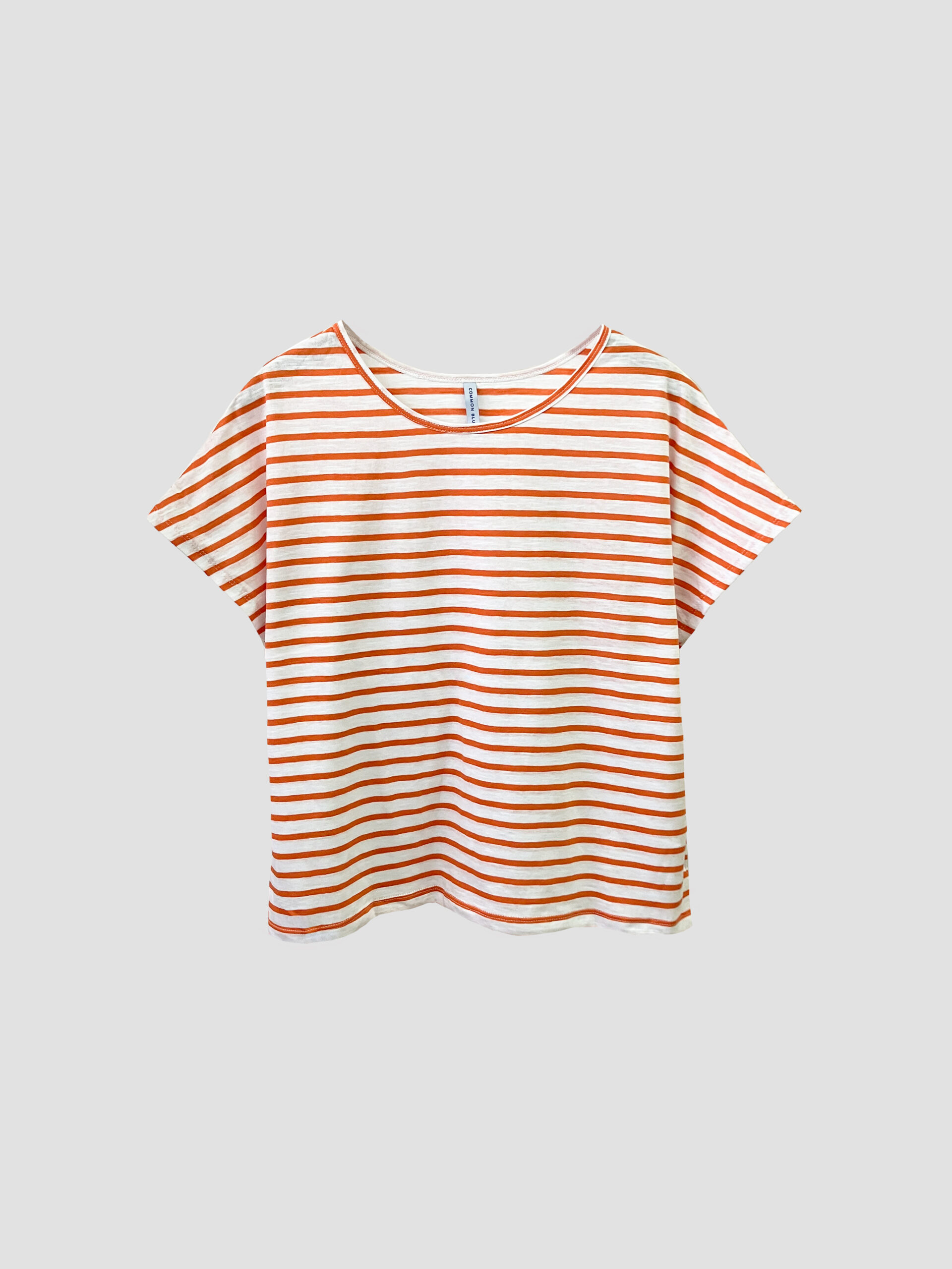 Remera rayada holgada con cuello redondo, hombros caídos y bajo recto.