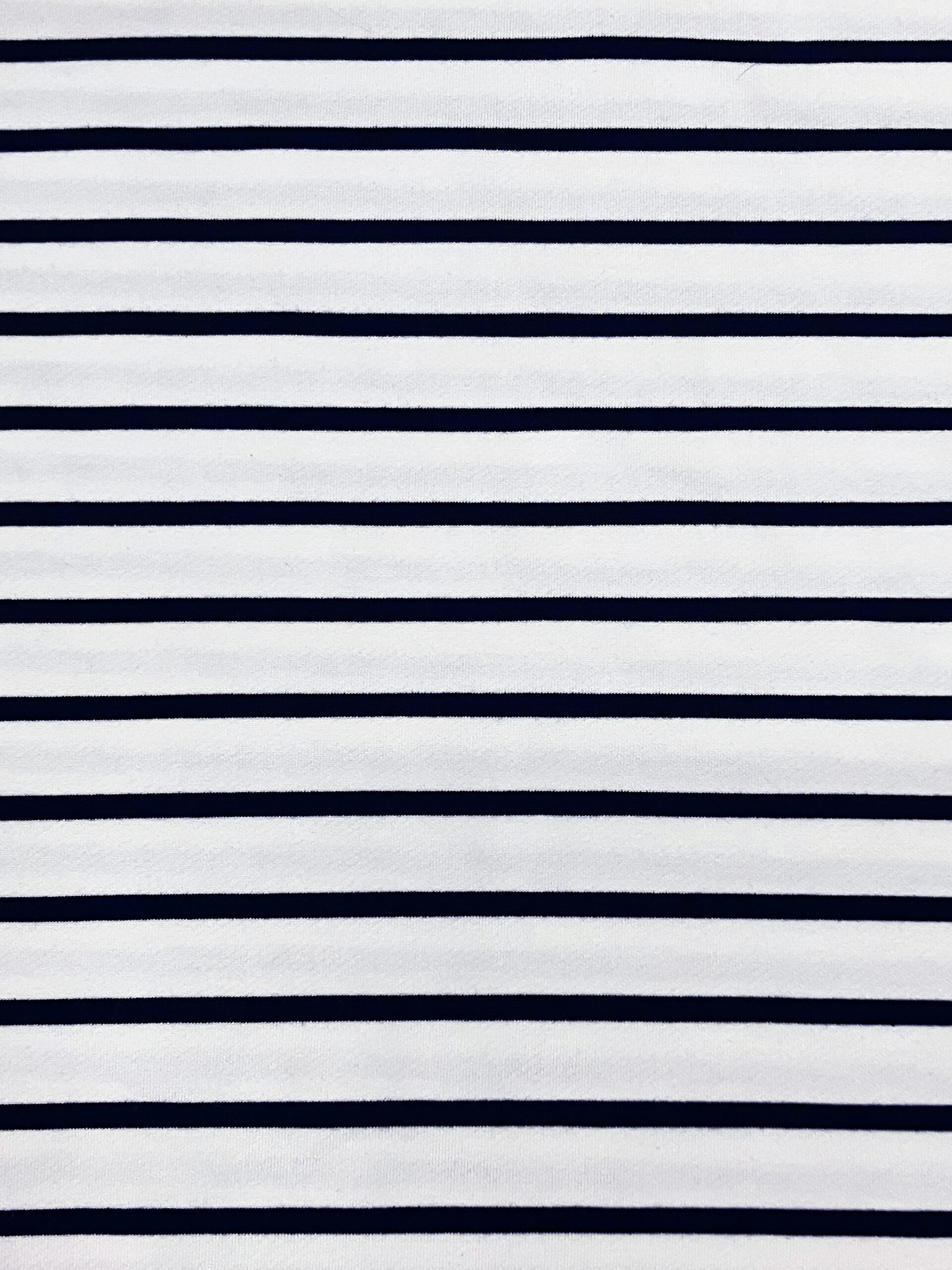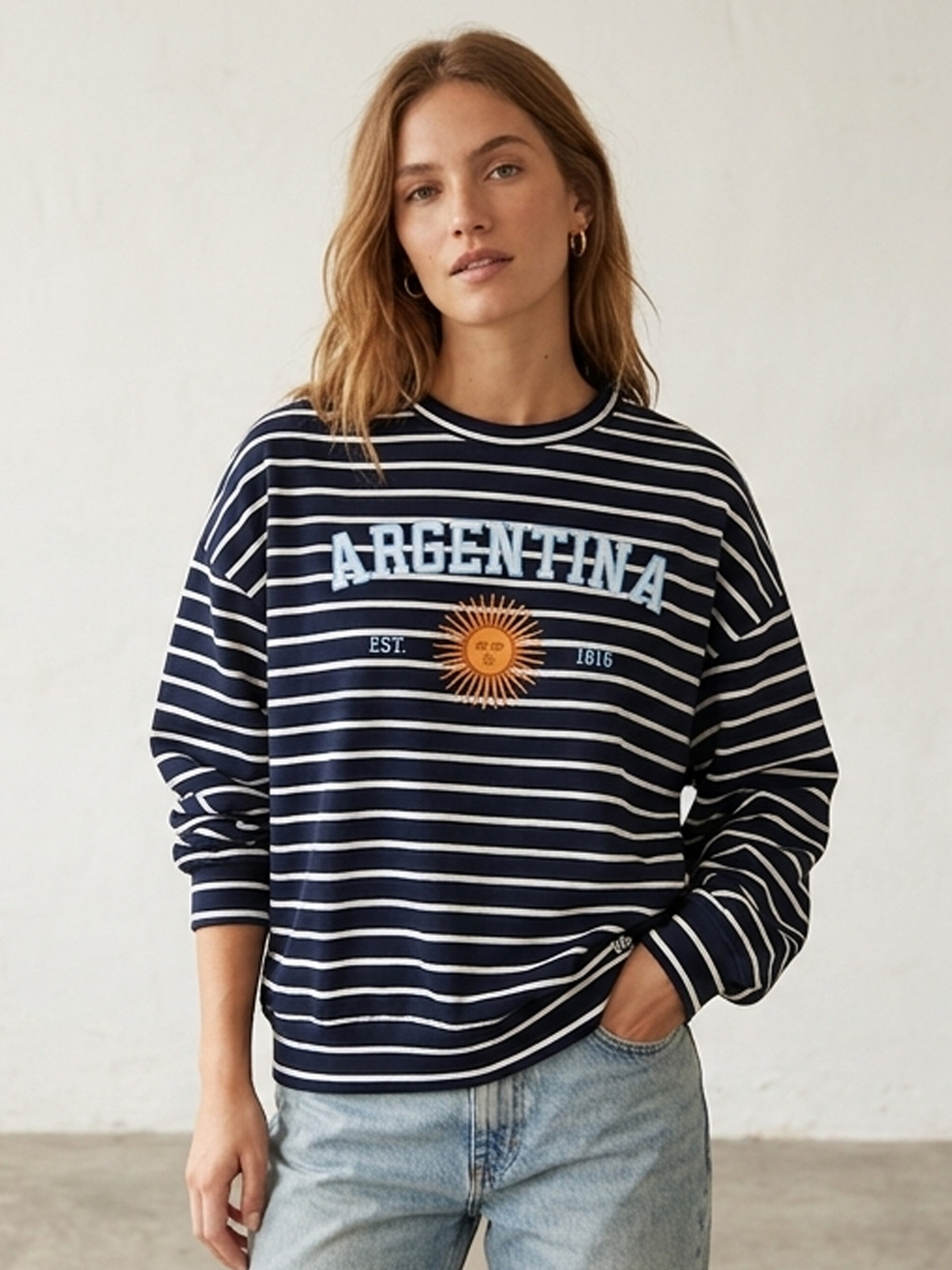 Buzo ancho rayado con cuello redondo y mangas anchas. Detalle de estampa en el delantero.