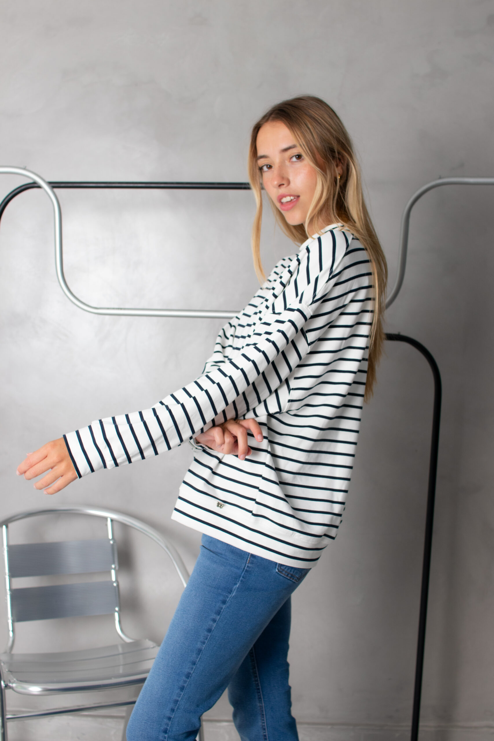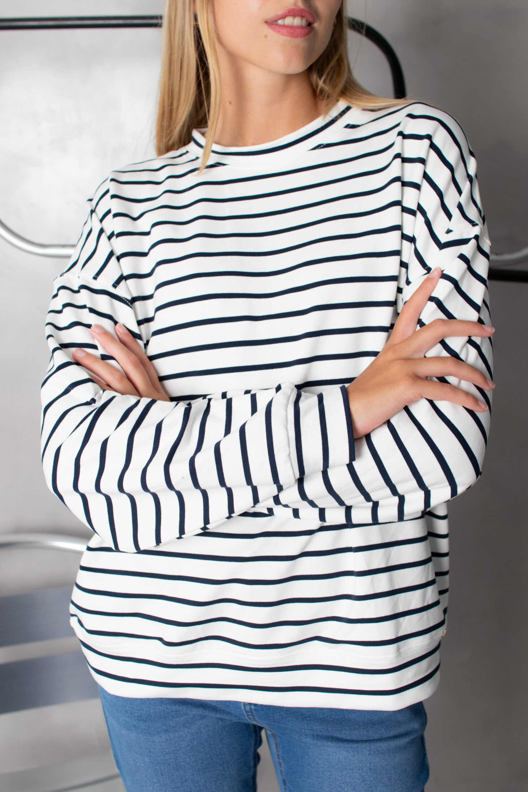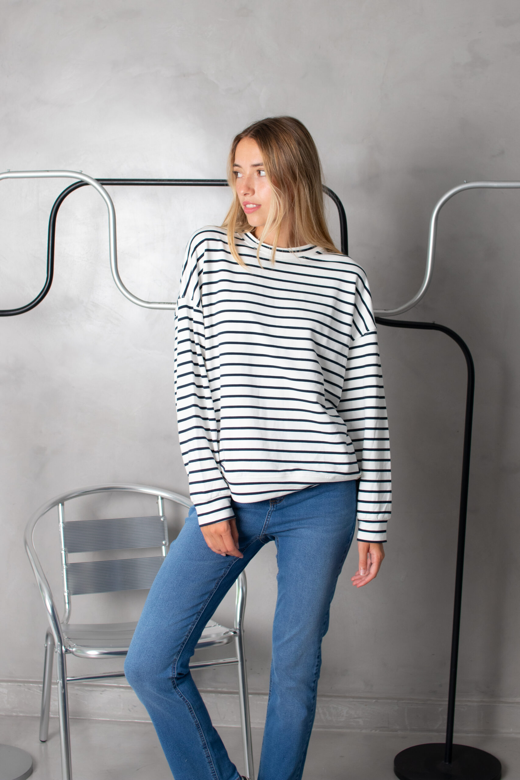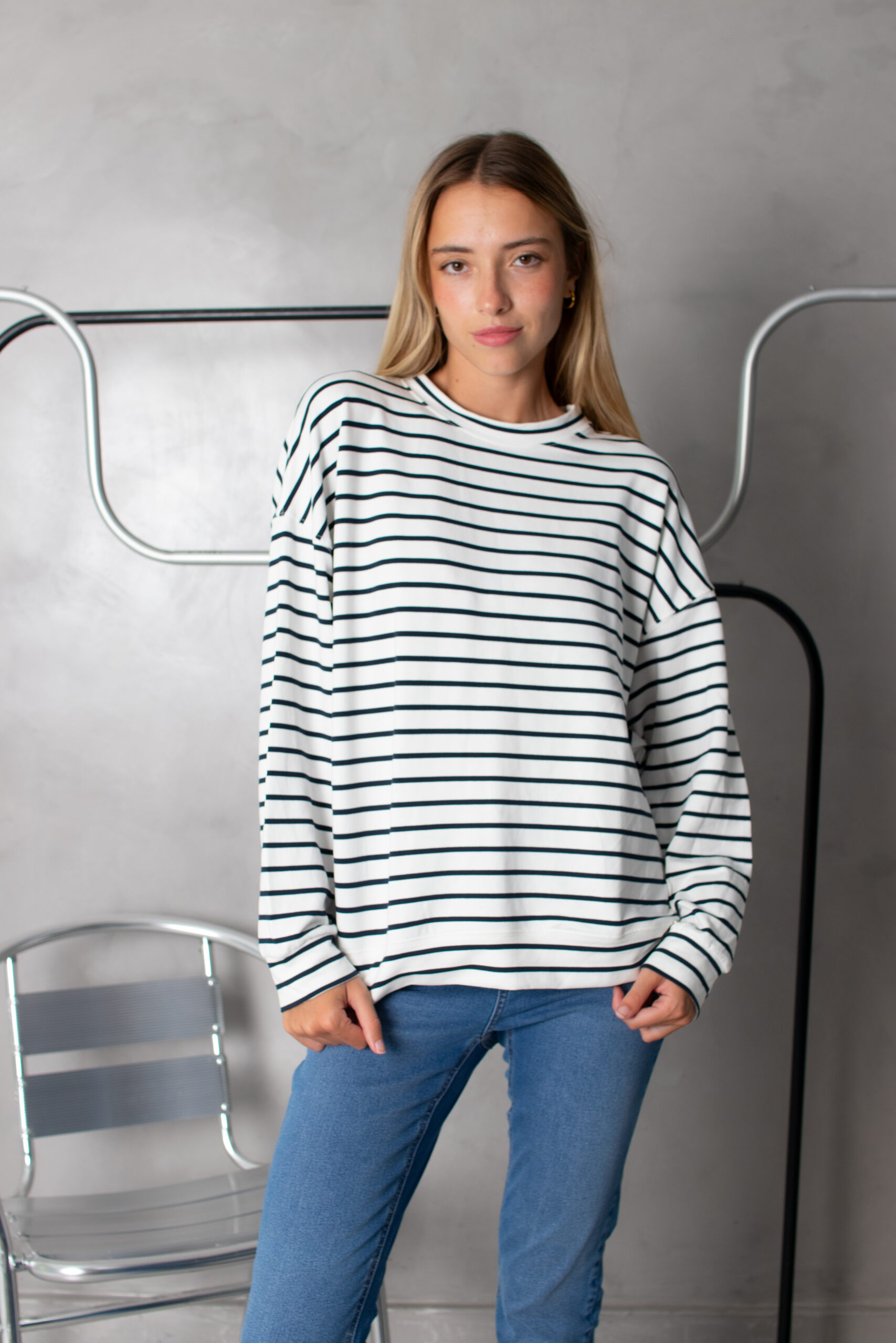 Buzo ancho de rustico rayado con cuello redondo y mangas anchas.