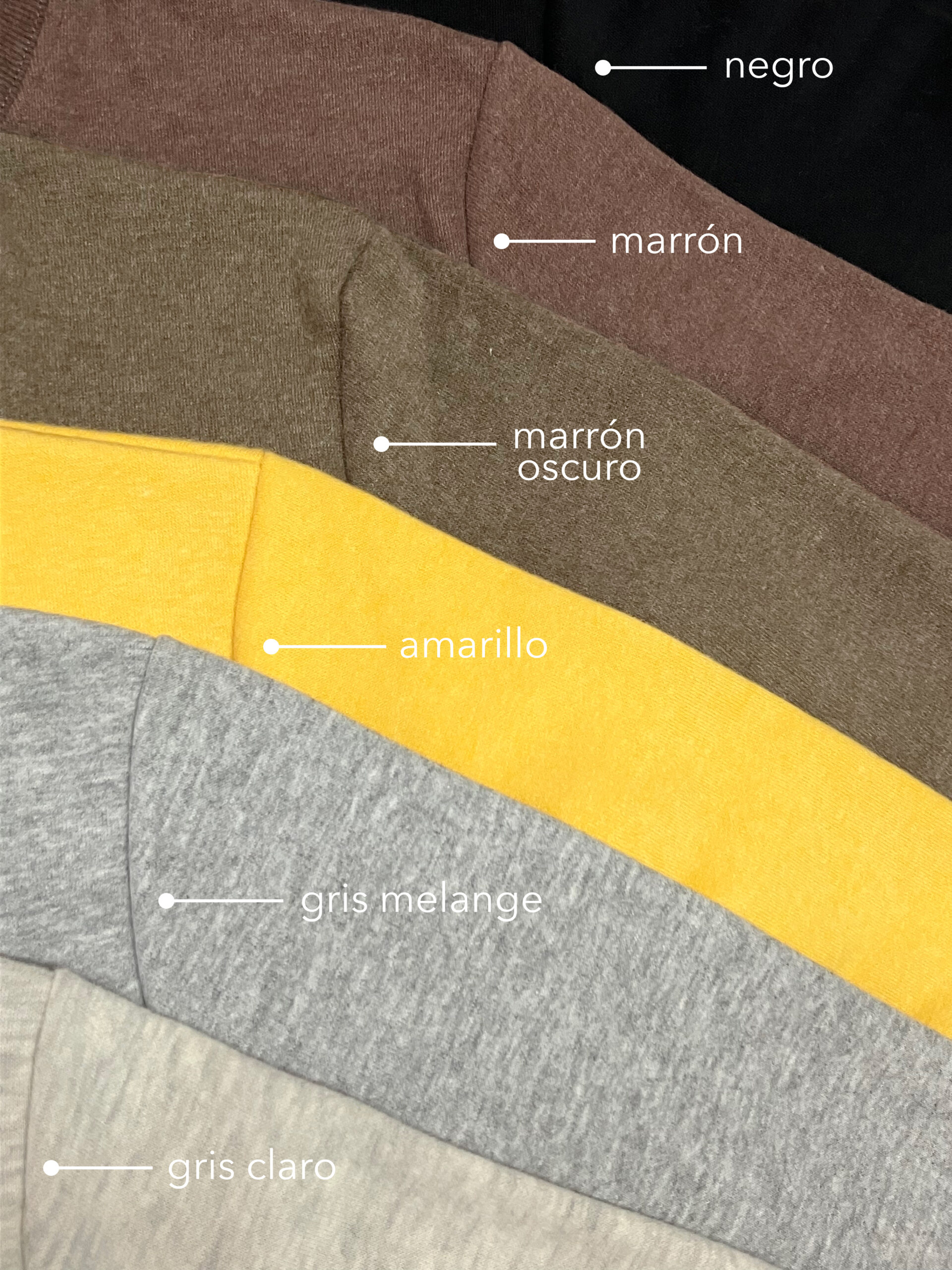 BEIGE CLARO, MARRÓN OSCURO, VERDE OSCURO, AMARILLO, AZUL, CORAL, CRUDO, GRIS MELANGE, GRIS OSCURO, MARRON, NEGRO