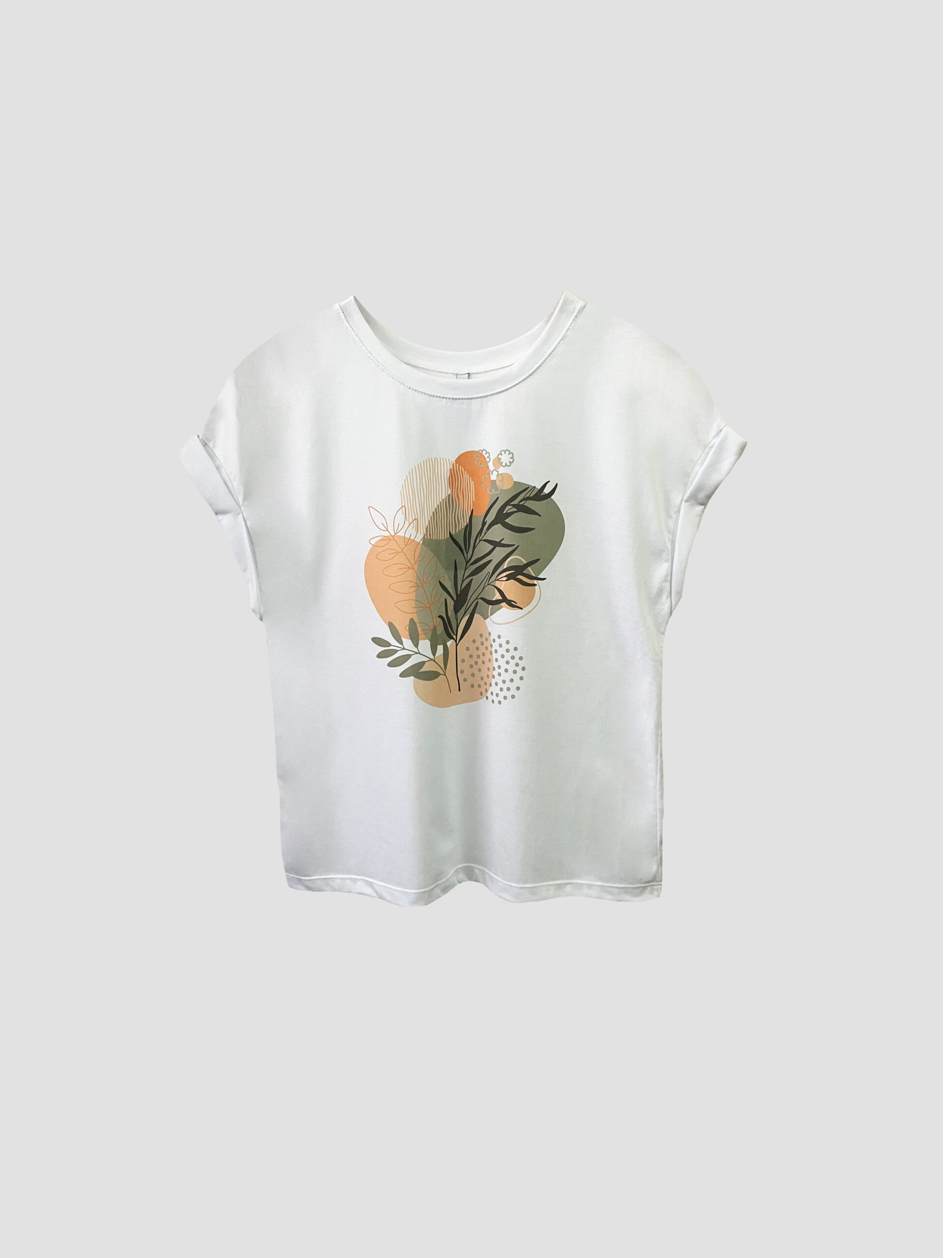 Remera manga corta con borde vuelto cosido. Modelo de hombro caído y bajo recto. Detalle de estampa en el delantero.