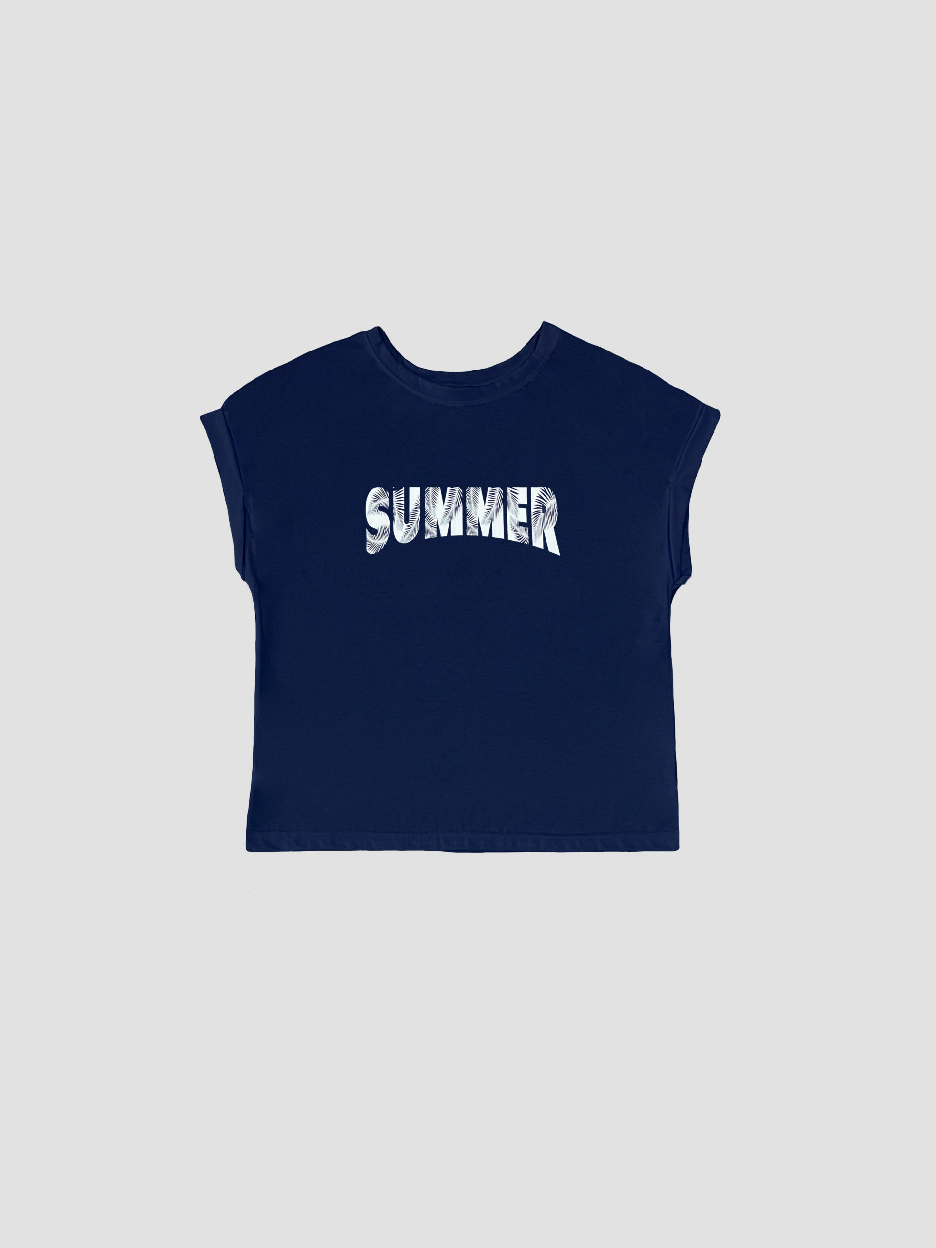 Remera manga corta con borde vuelto cosido. Modelo de hombro caídos y bajo recto. Detalle de estampa en el delantero.
