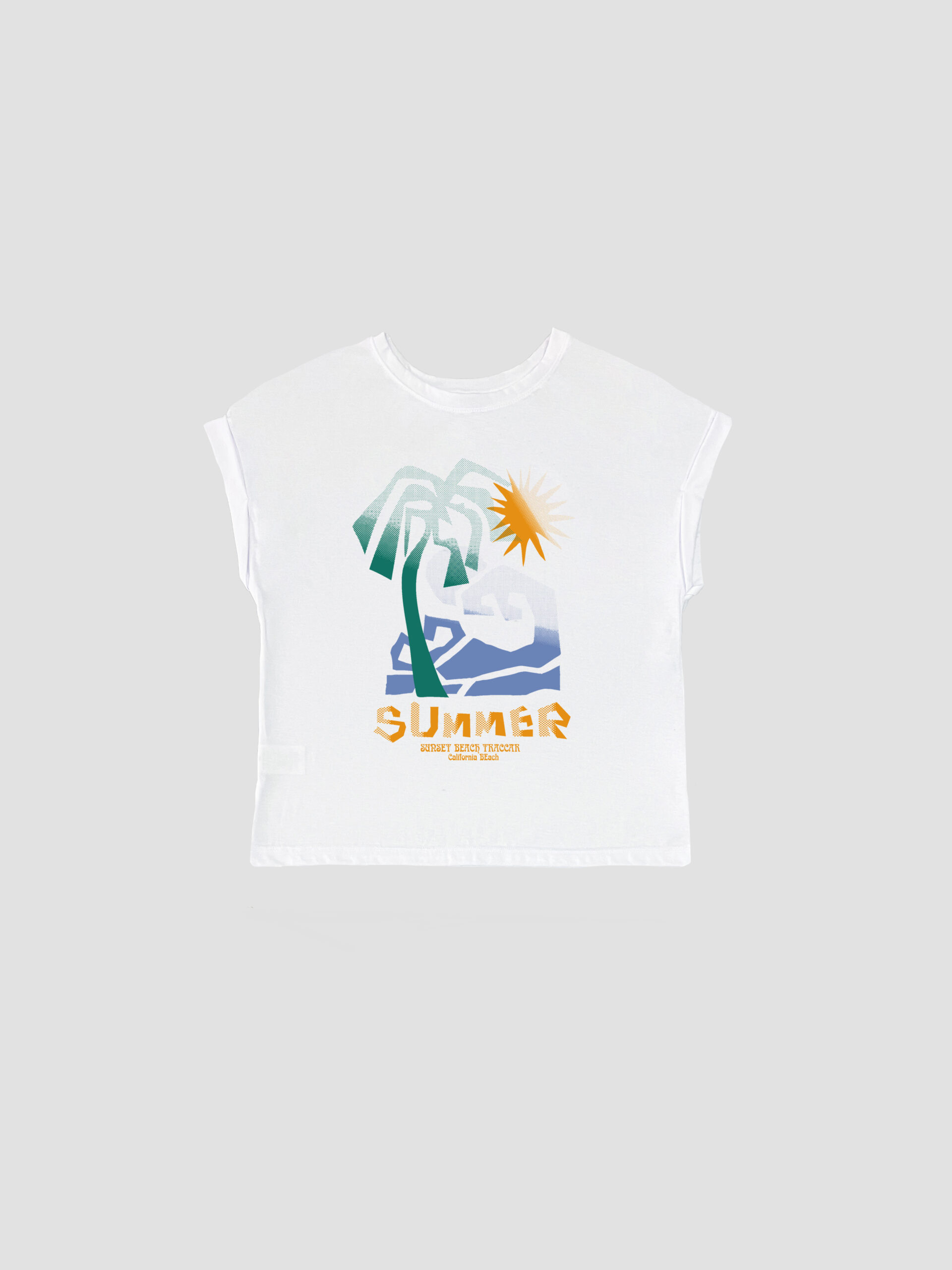 Remera manga corta con borde vuelto cosido. Modelo de hombro caído y bajo recto. Detalle de estampa en el delantero.
