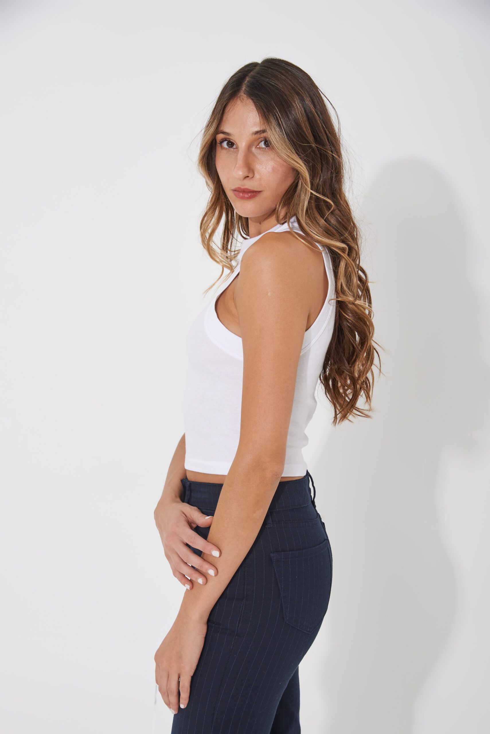 Musculosa con cuello redondo, bajo recto y puño en morley.
