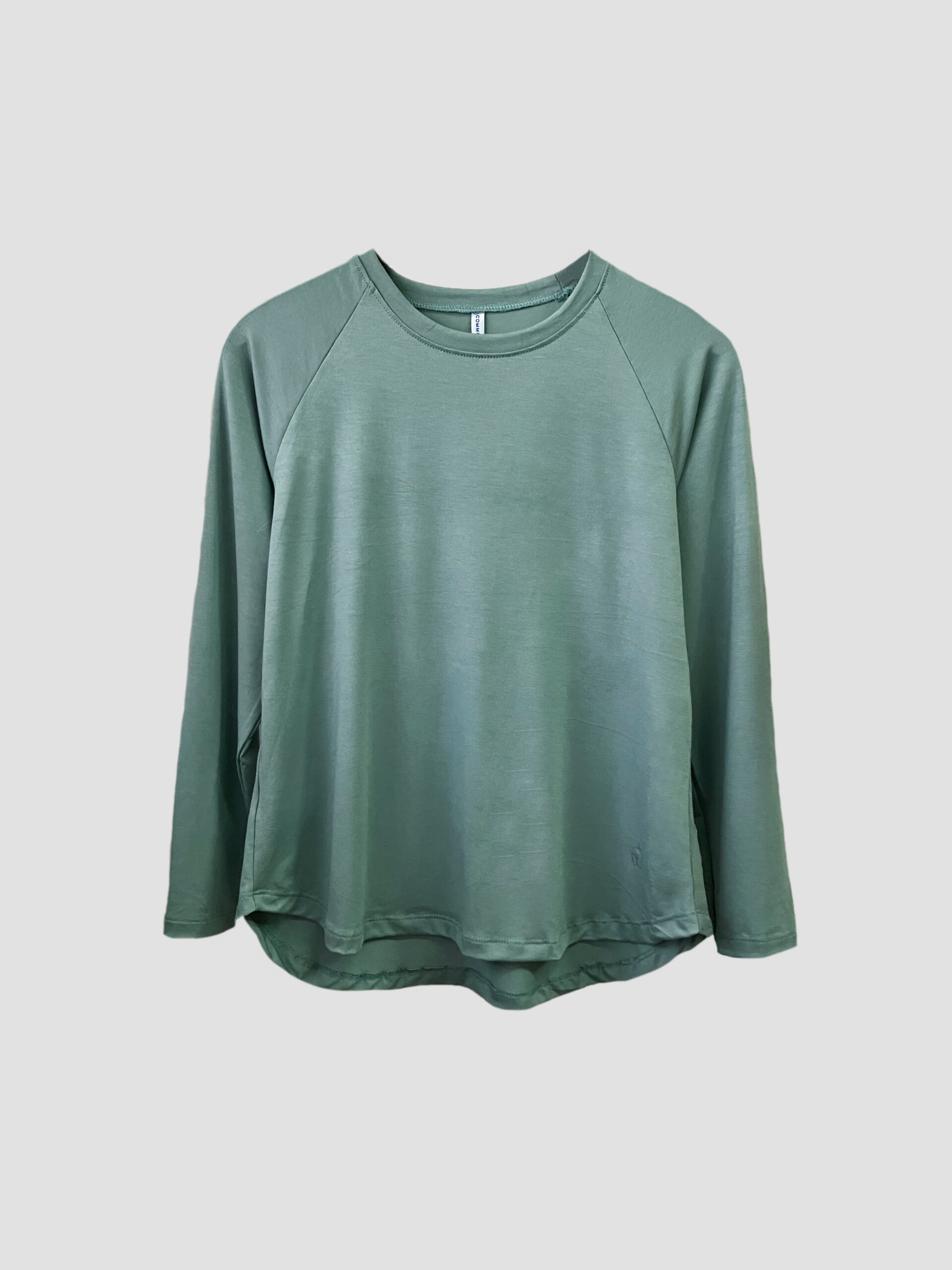 Remera manga ranglan larga con cuello redondo y bajo redondeado.