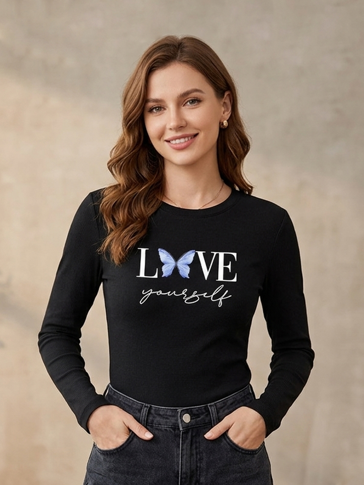 Remera básica manga larga con cuello redondo y bajo recto. Detalle de estampa en el delantero.