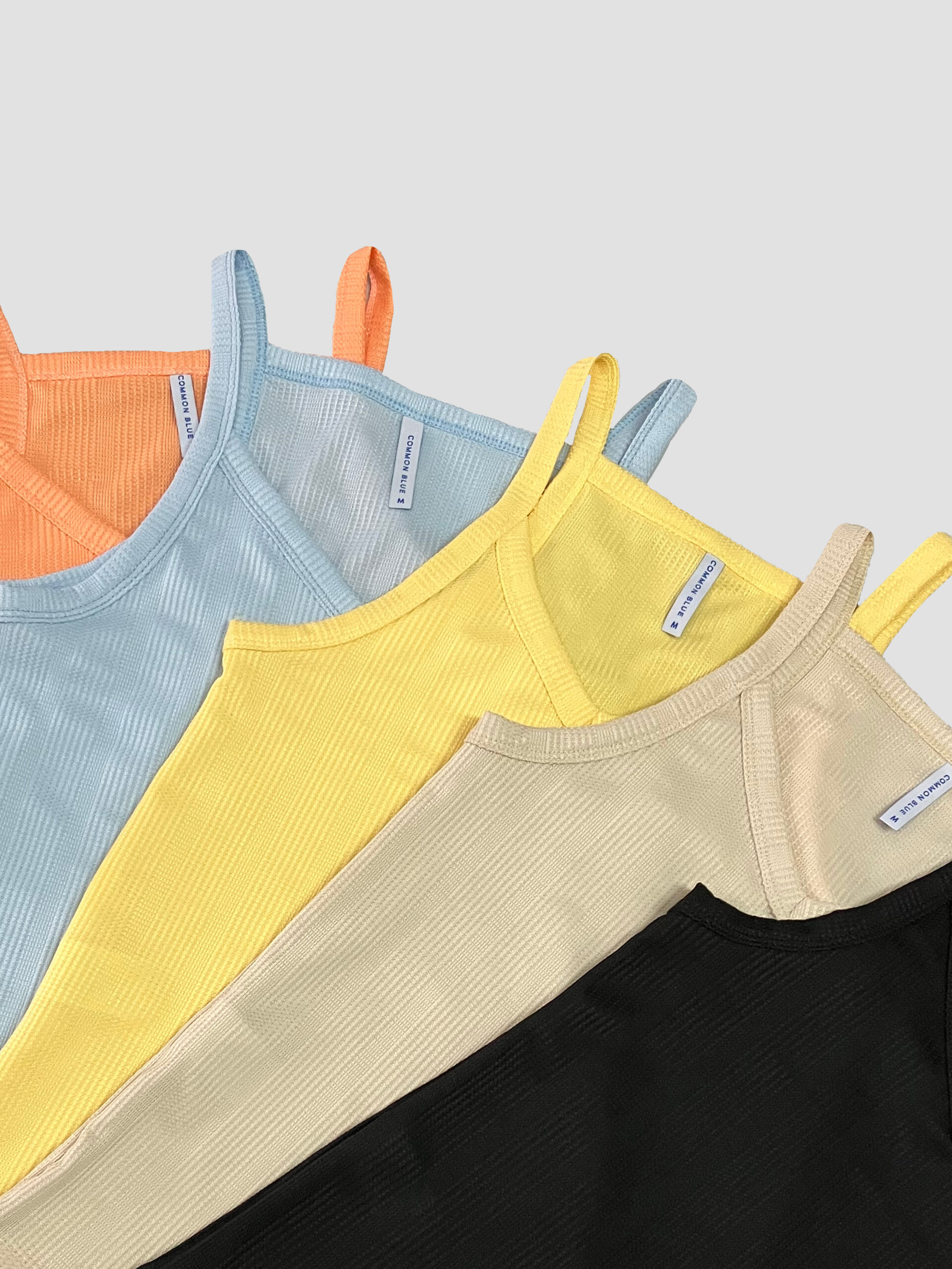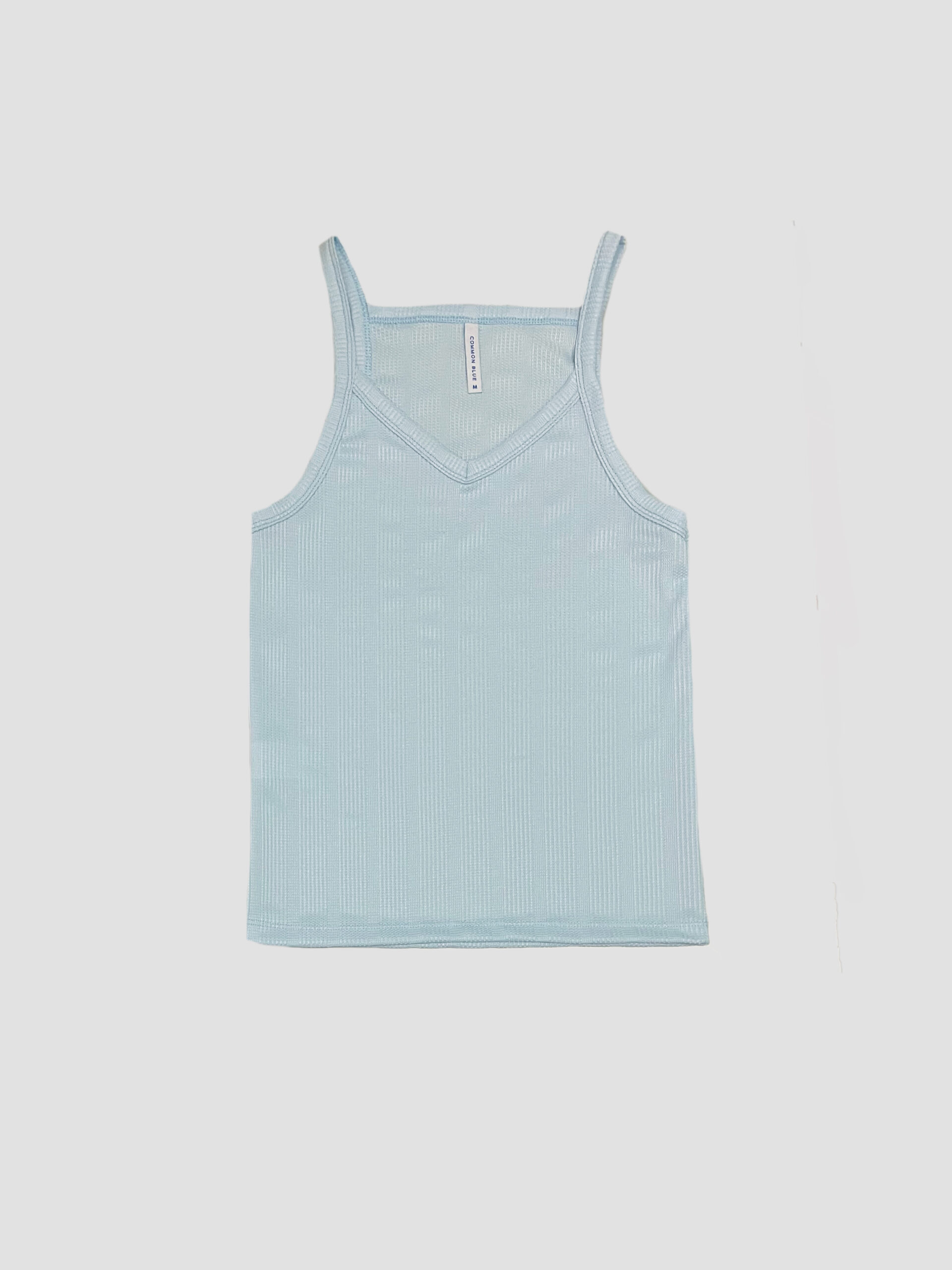 Musculosa de escote “V” y tirantes finos. Largo hasta la cadera. Bajo recto.