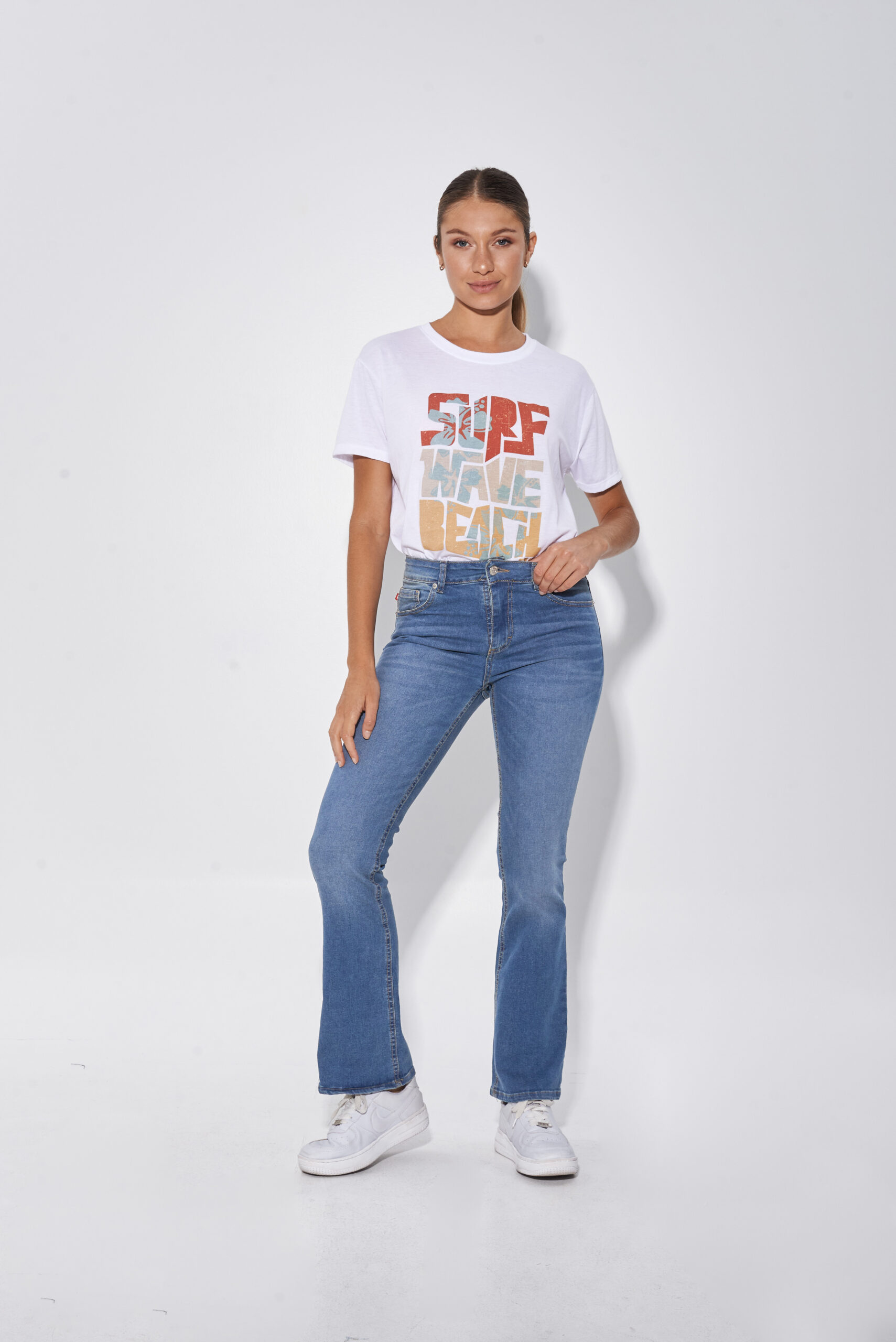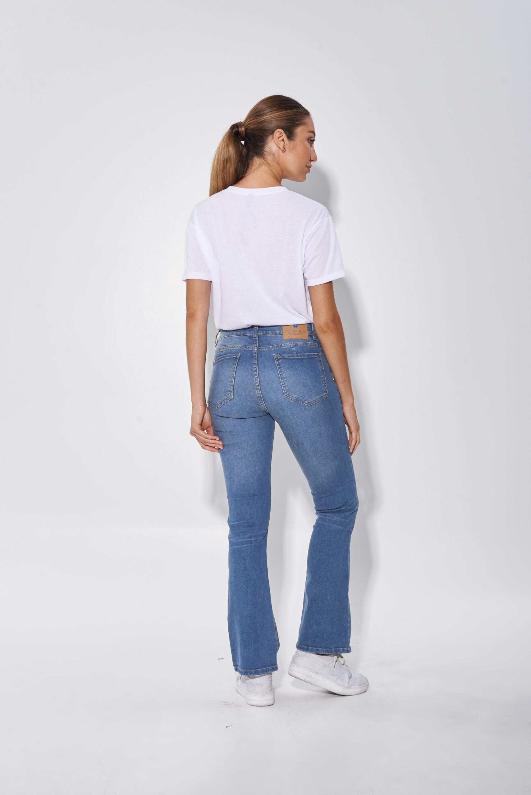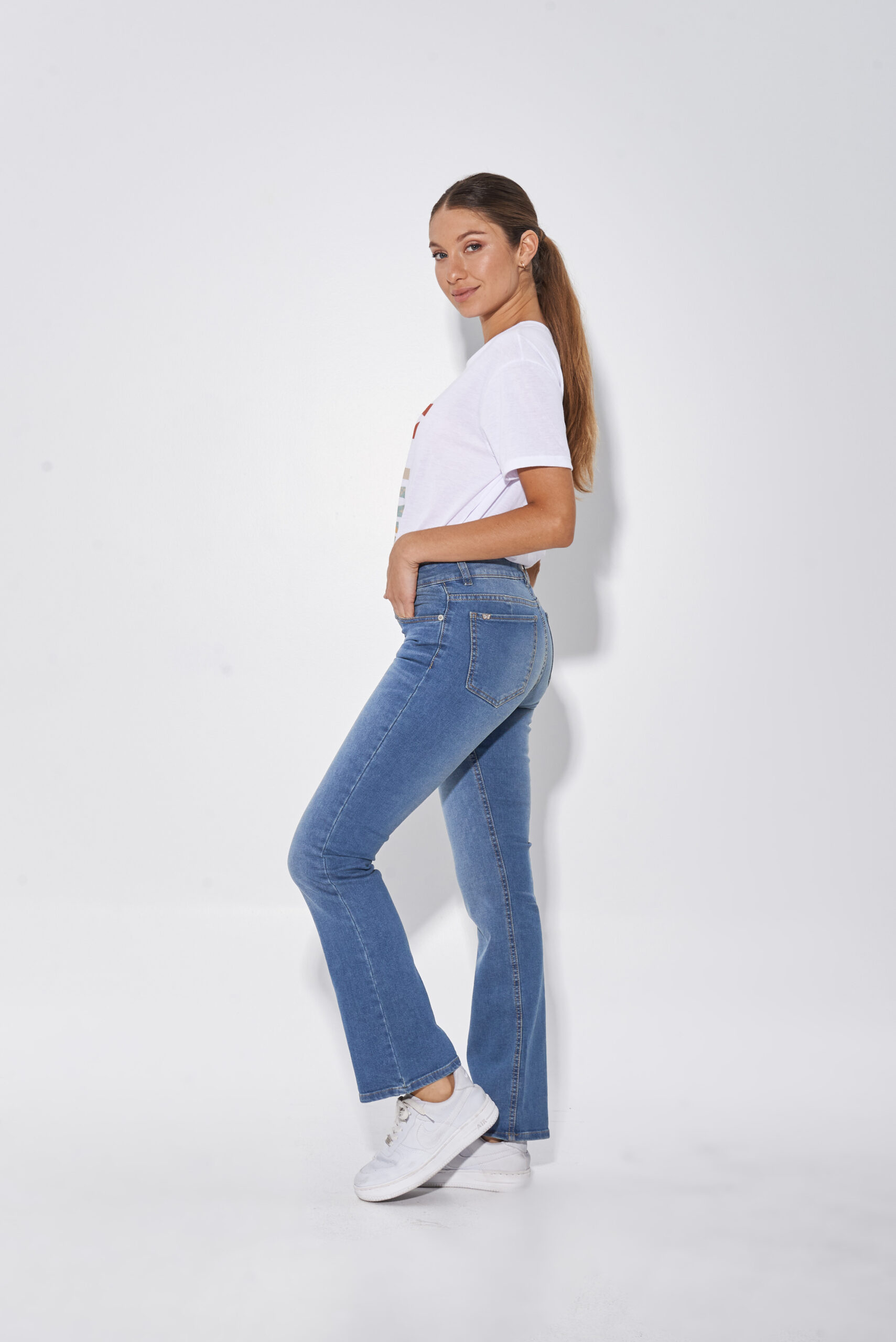 Jean semioxford tiro medio con cinco bolsillos, cierre frontal y botón metálico. Lavado Stone 5% elastizado.