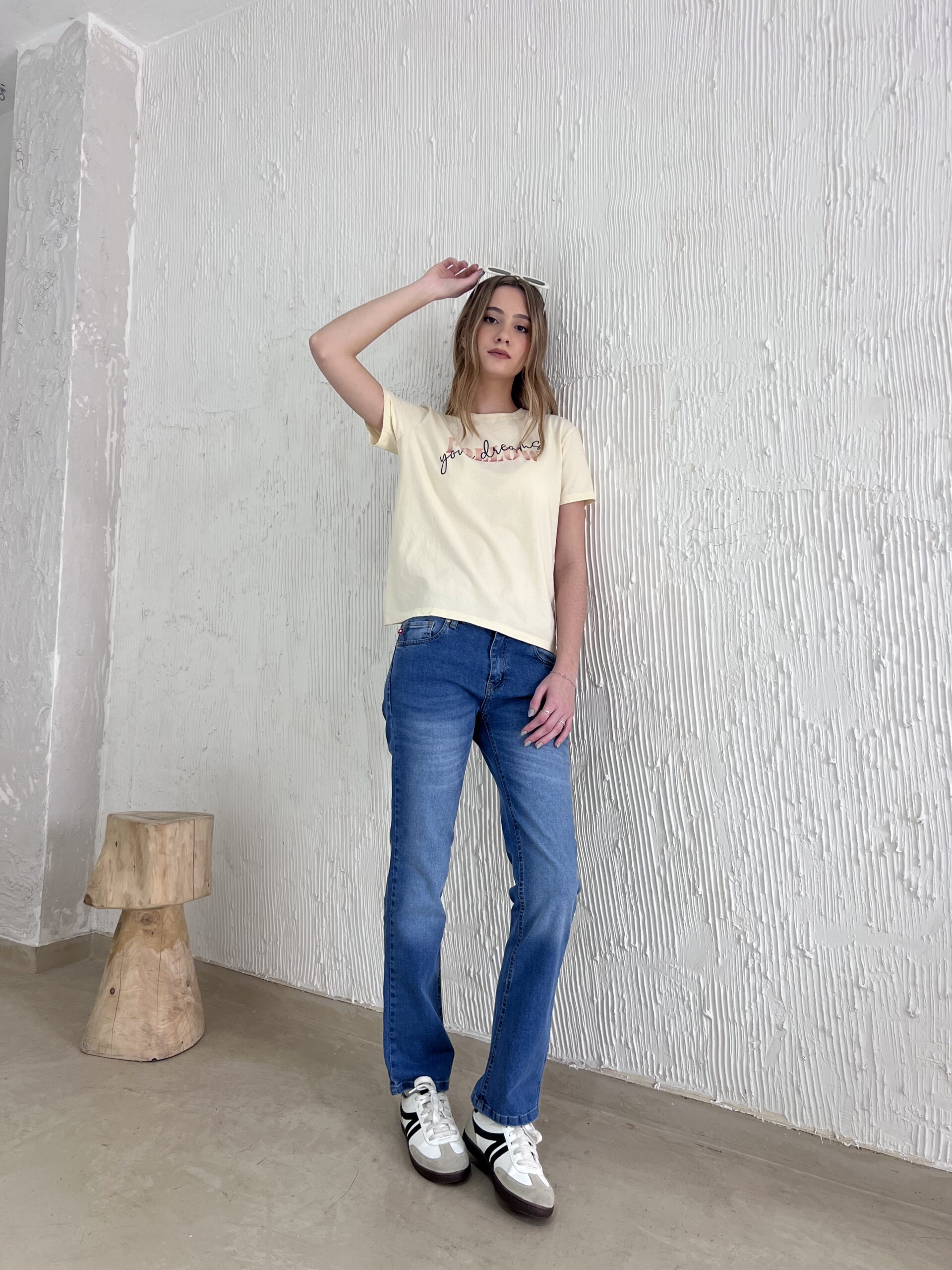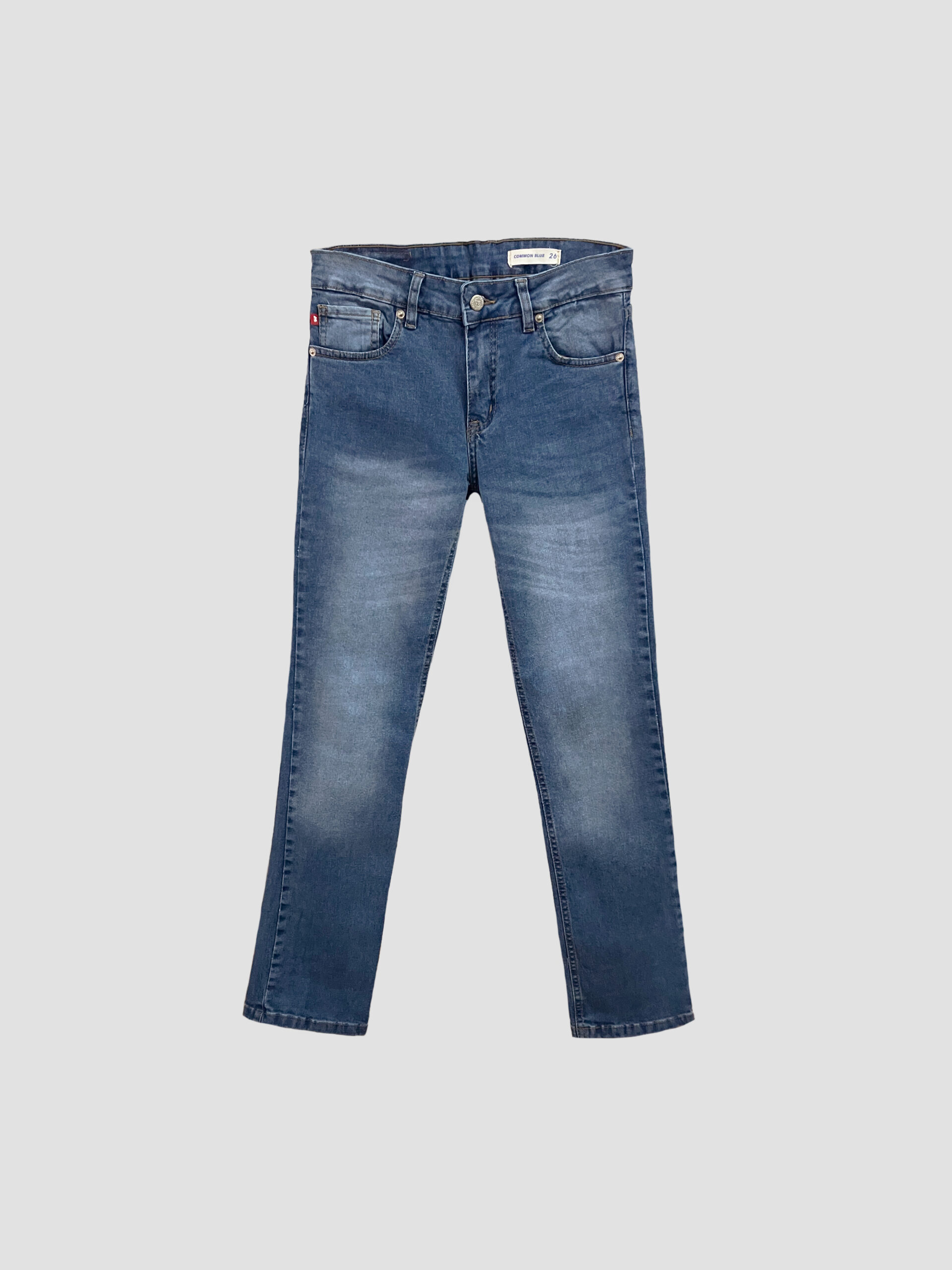 Jean recto tiro medio elastizado con cinco bolsillos, cierre frontal y botón metálico. Lavado Stone 5% y localizado.