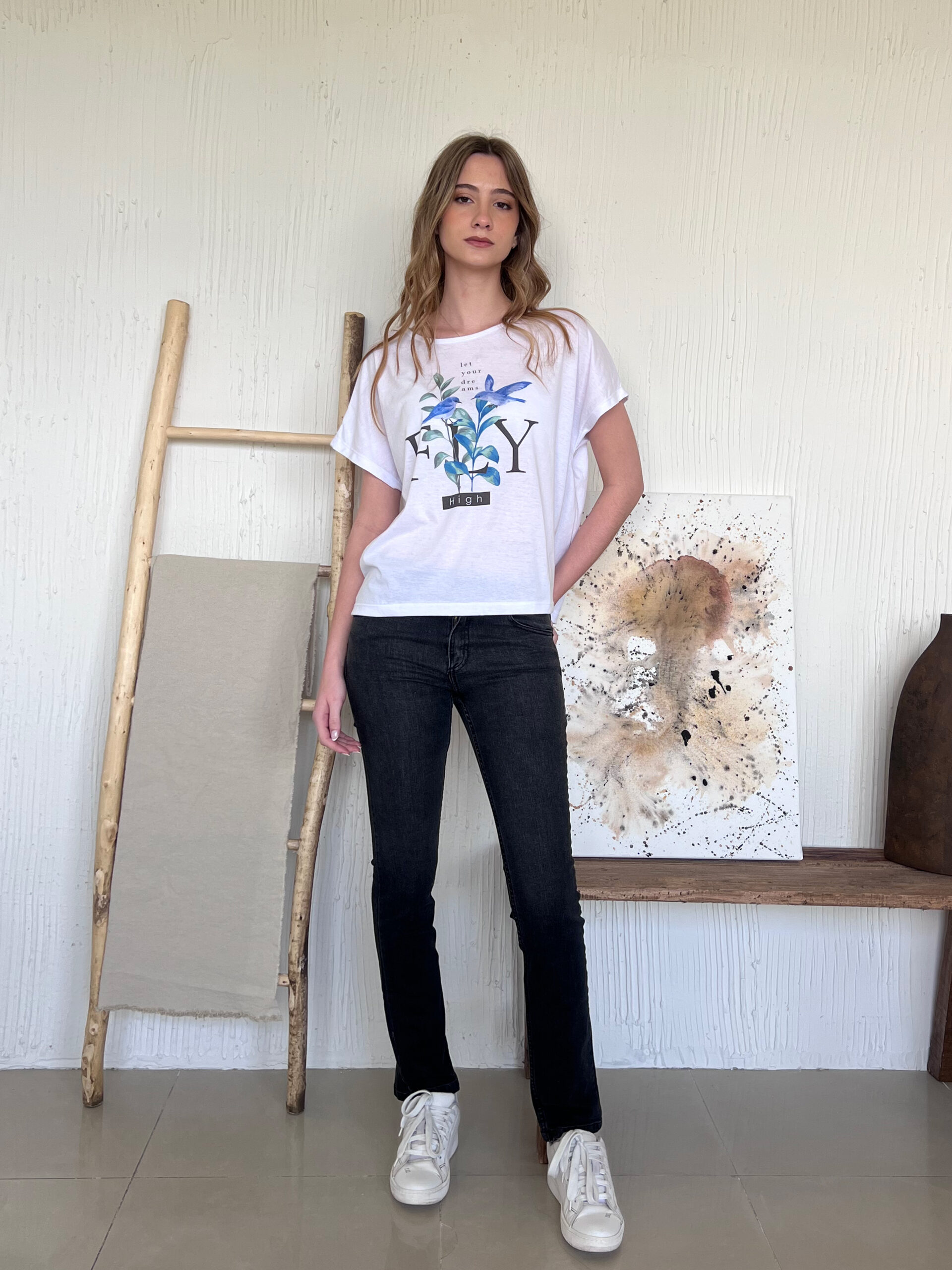 Jean recto tiro medio elastizado con cinco bolsillos, cierre frontal y botón metálico. Jean localizado.