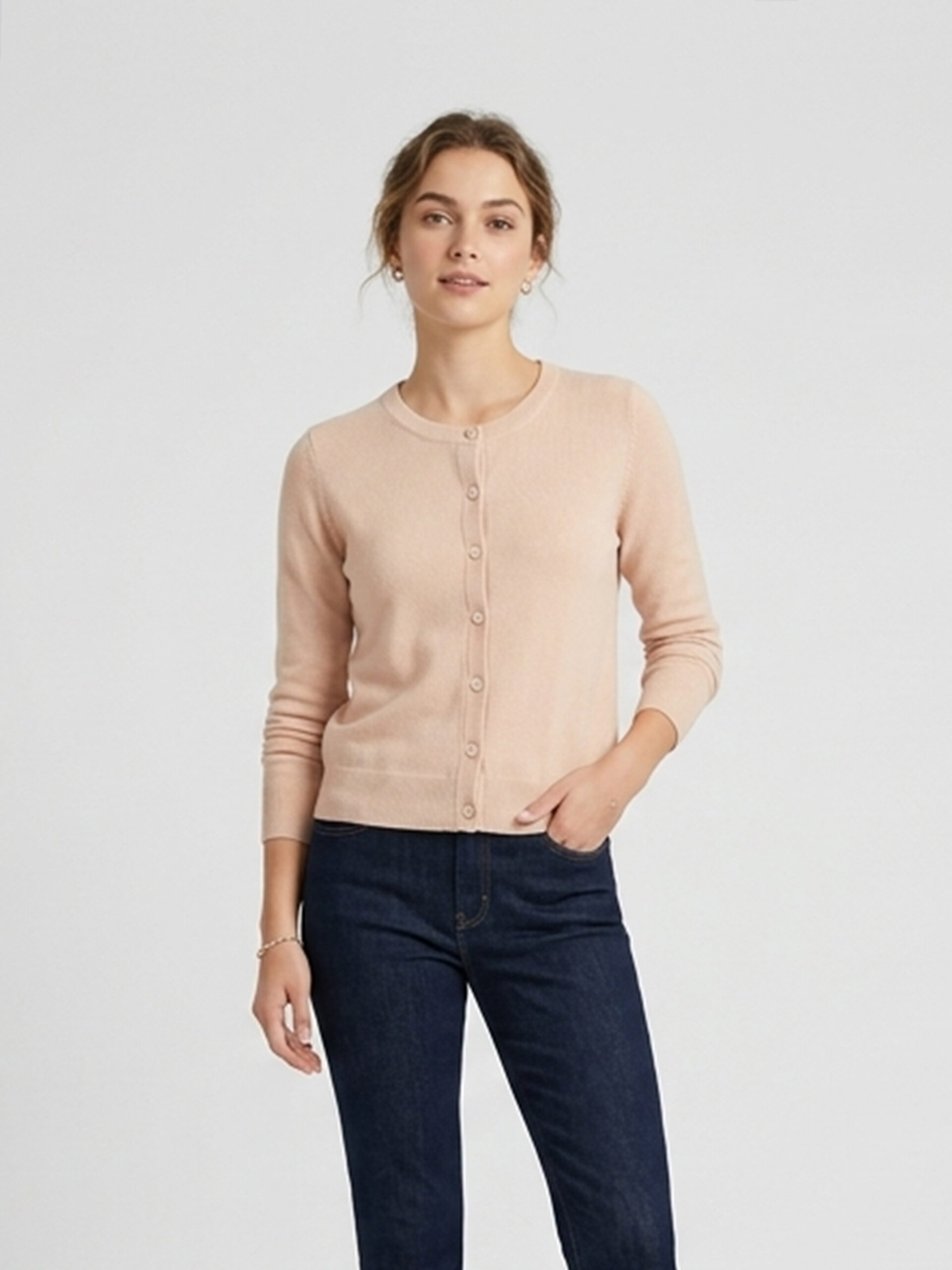 Cárdigan liviano manga larga con botones, cuello redondo y bajo recto.