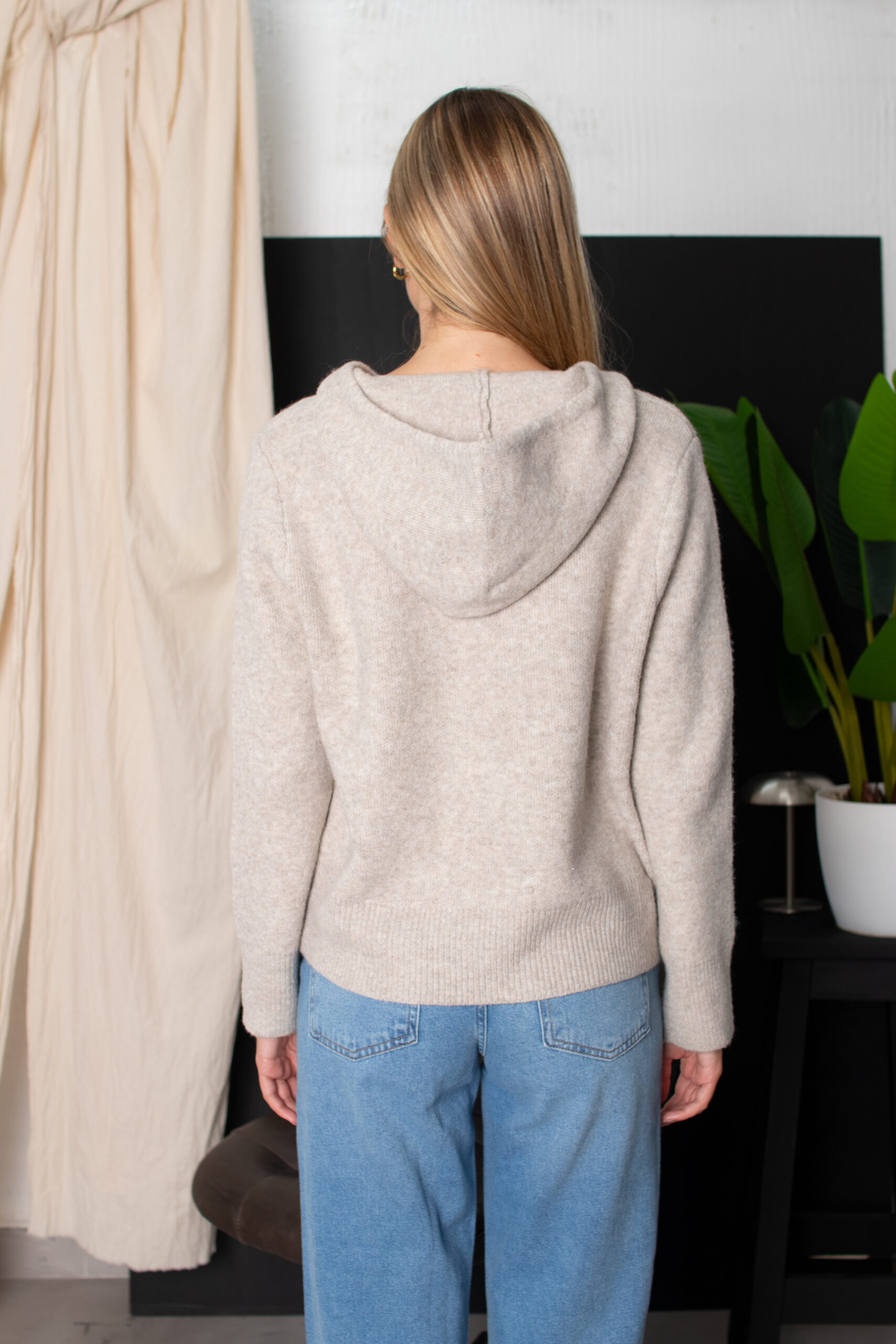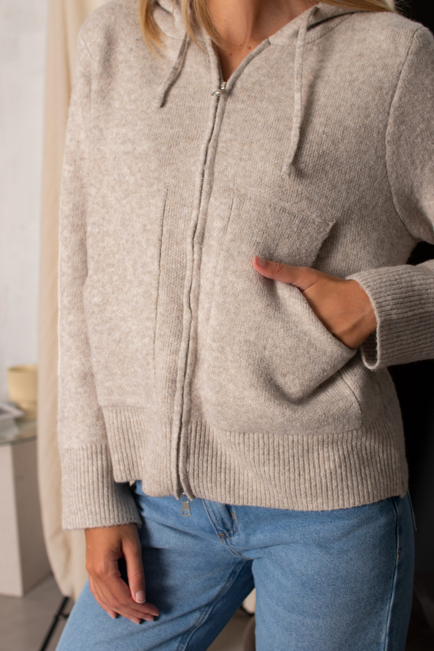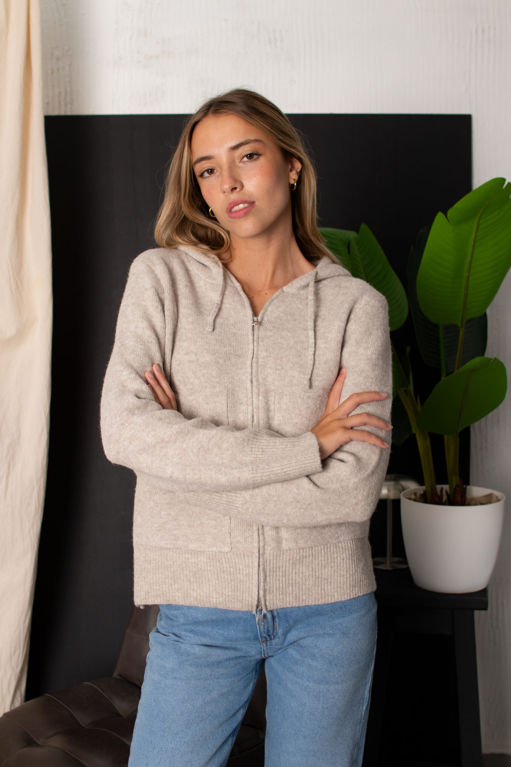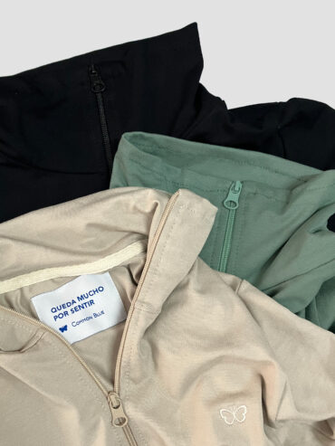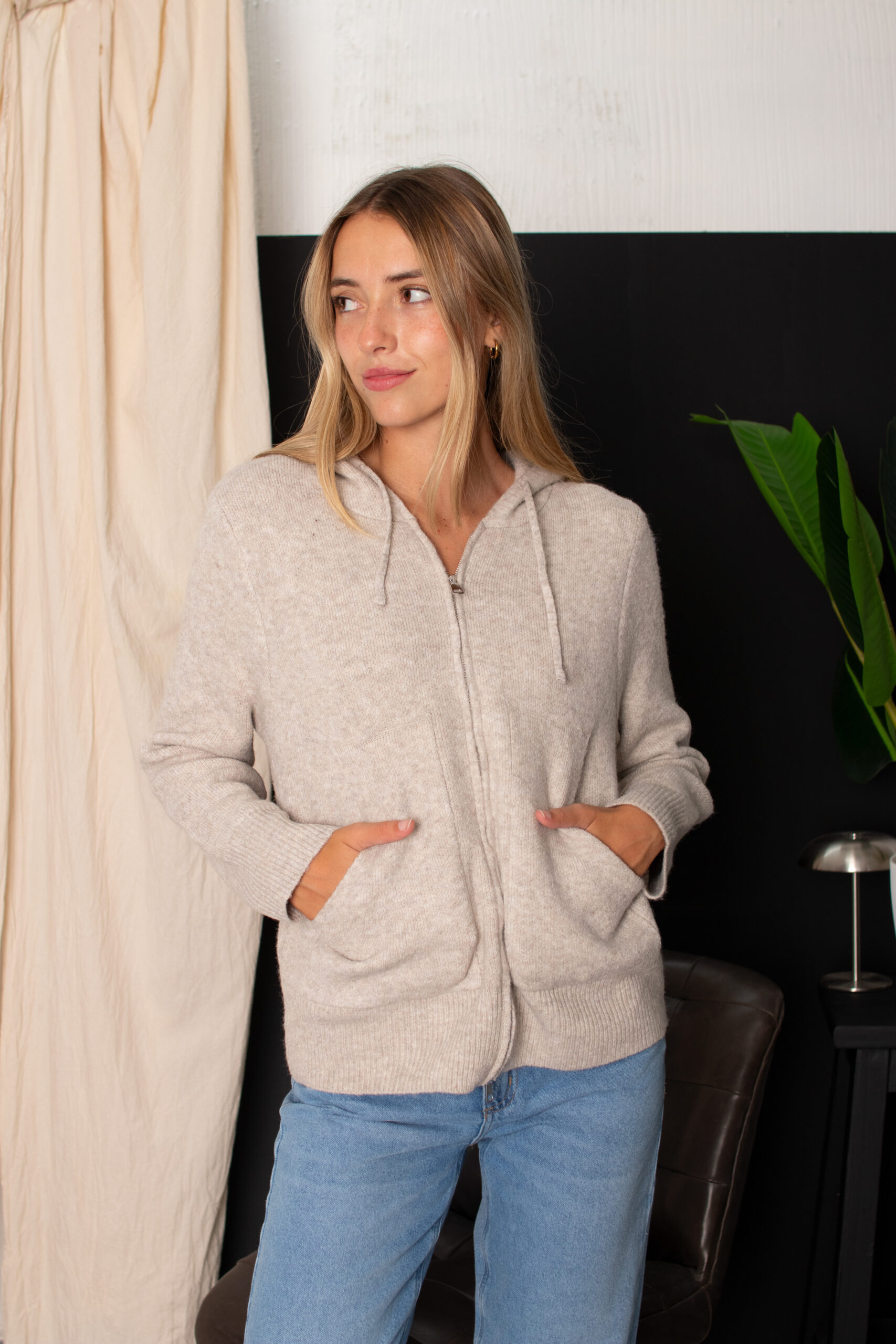 Campera manga larga con capucha, cordones ajustables, cierre bidireccional y dos bolsillos en el delantero.