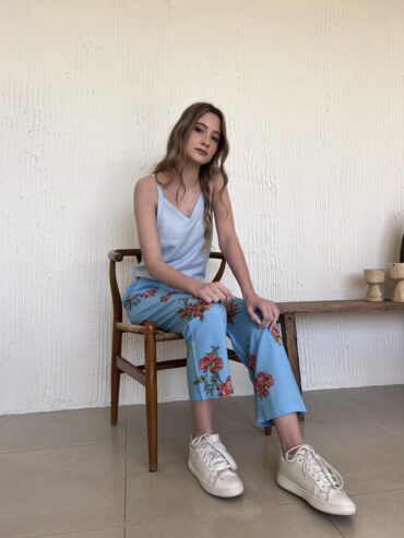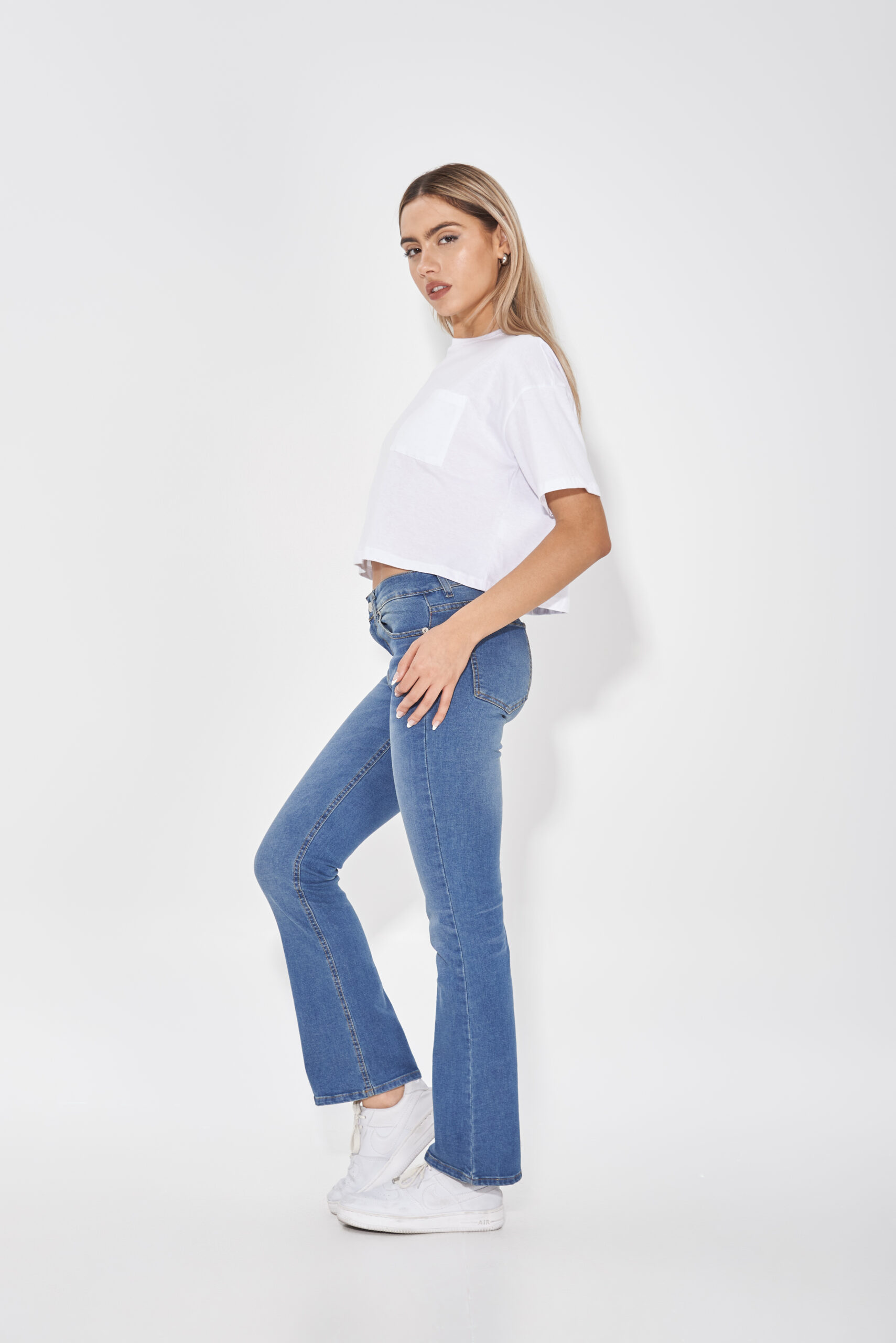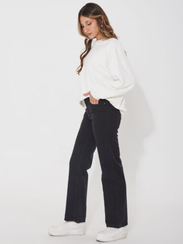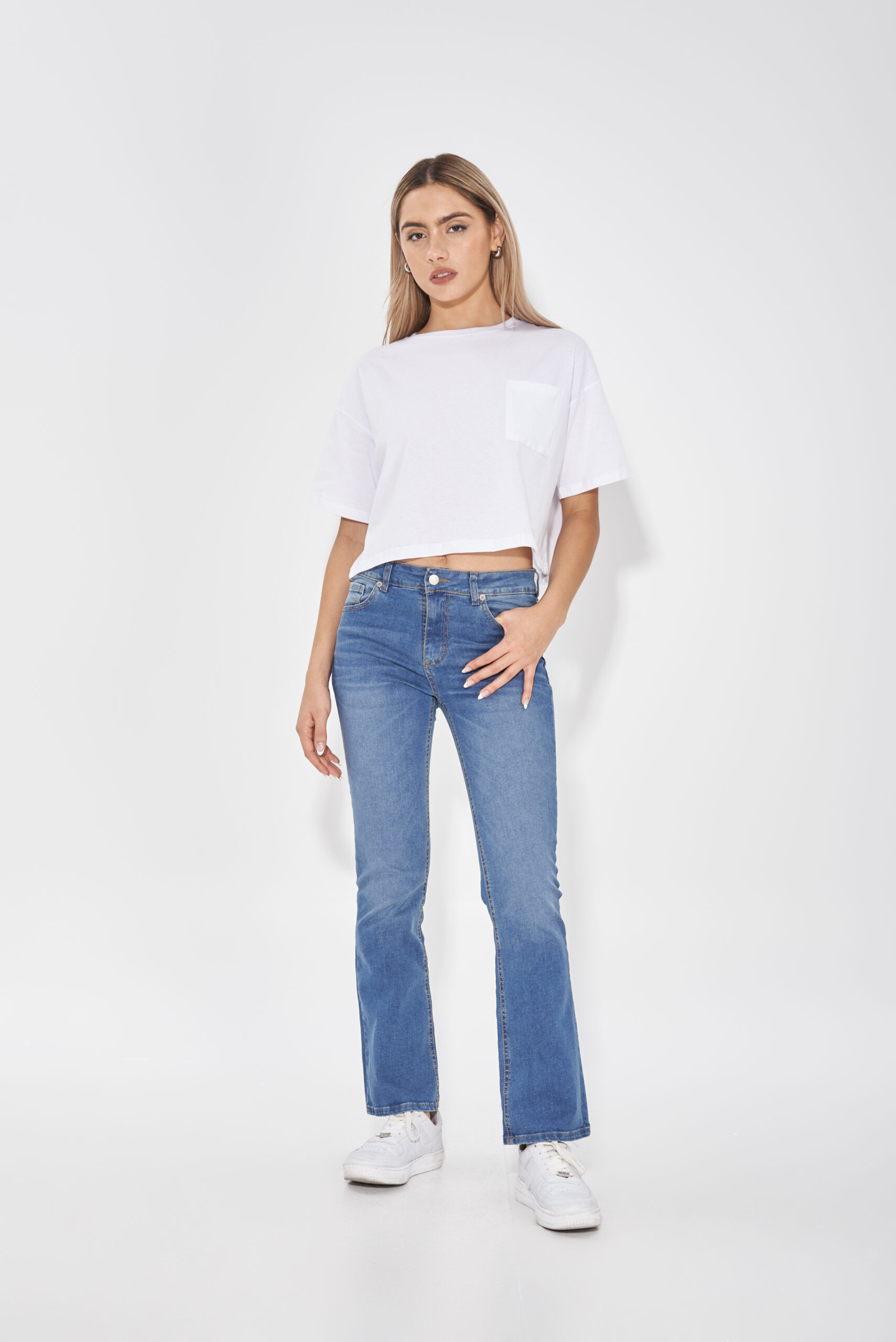 Jean semioxford tiro medio con cinco bolsillos, cierre frontal y botón metálico. Lavado Stone 5% con leve bigote.