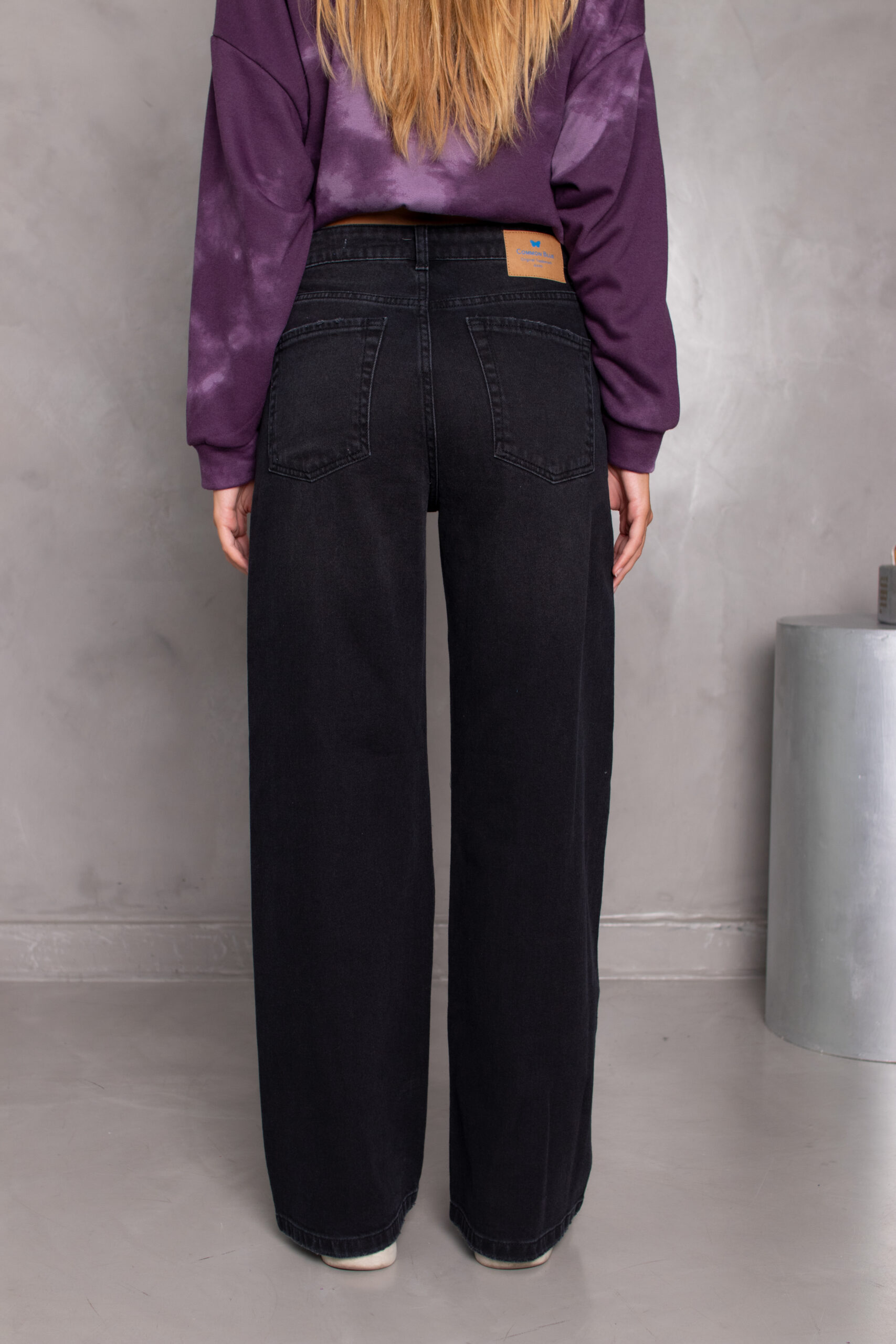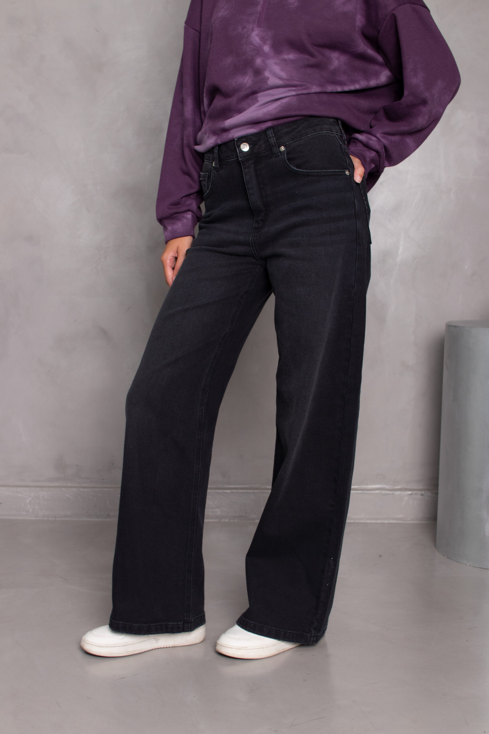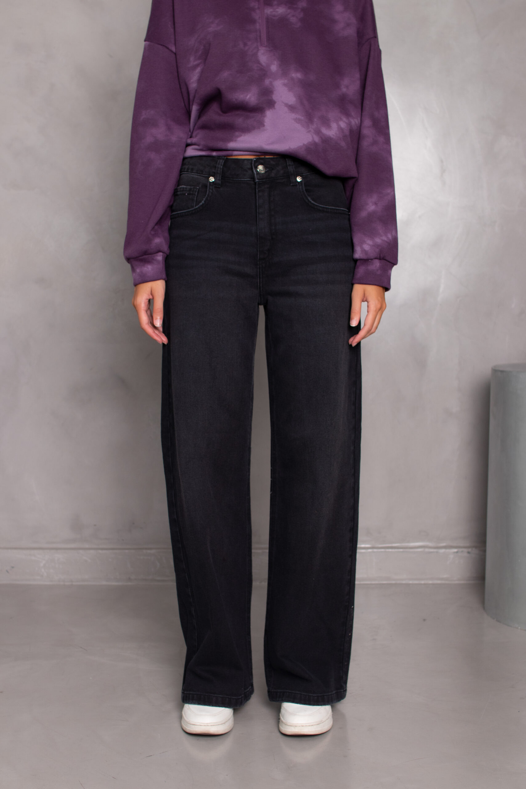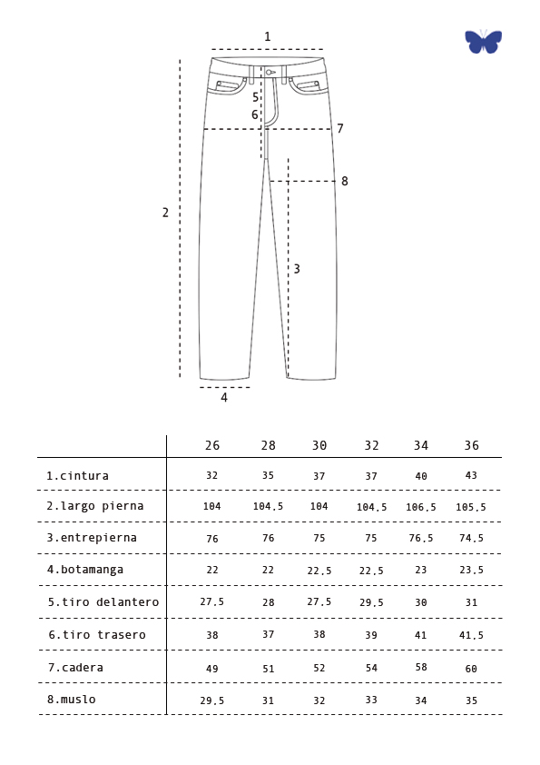 Jean recto tiro alto con cinco bolsillos, cierre frontal y botón metálico.