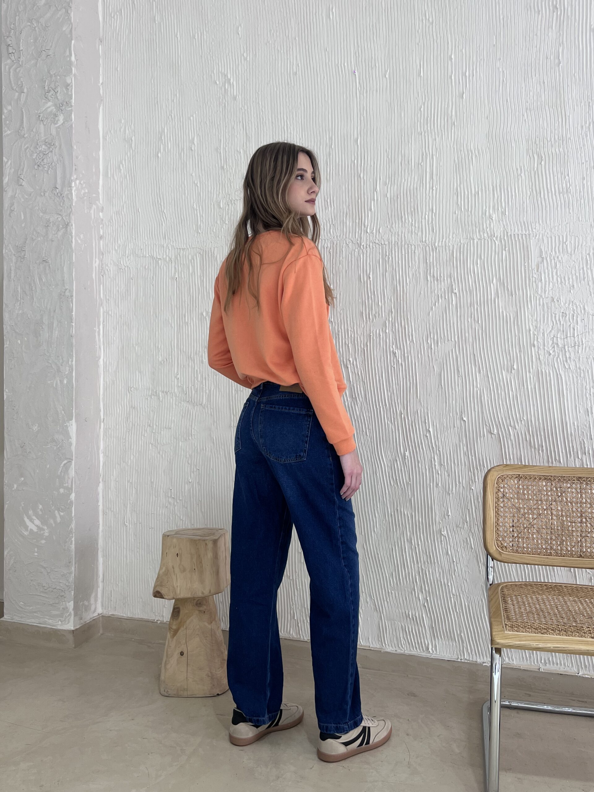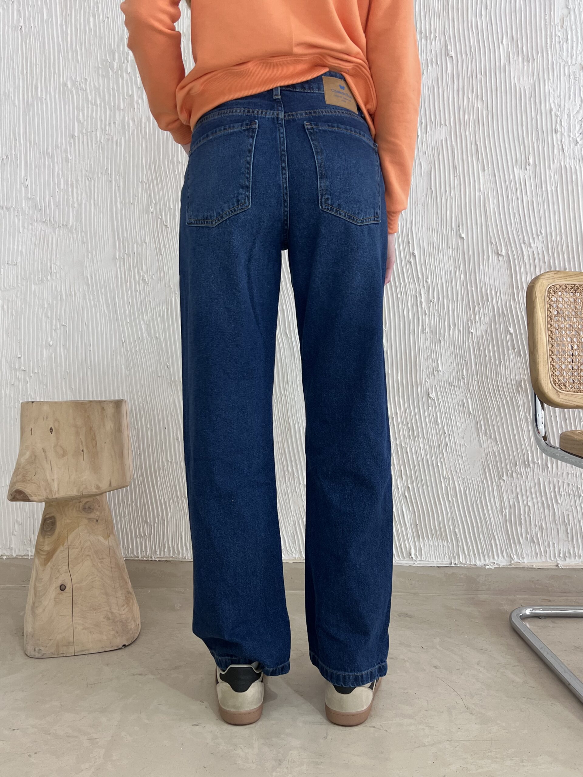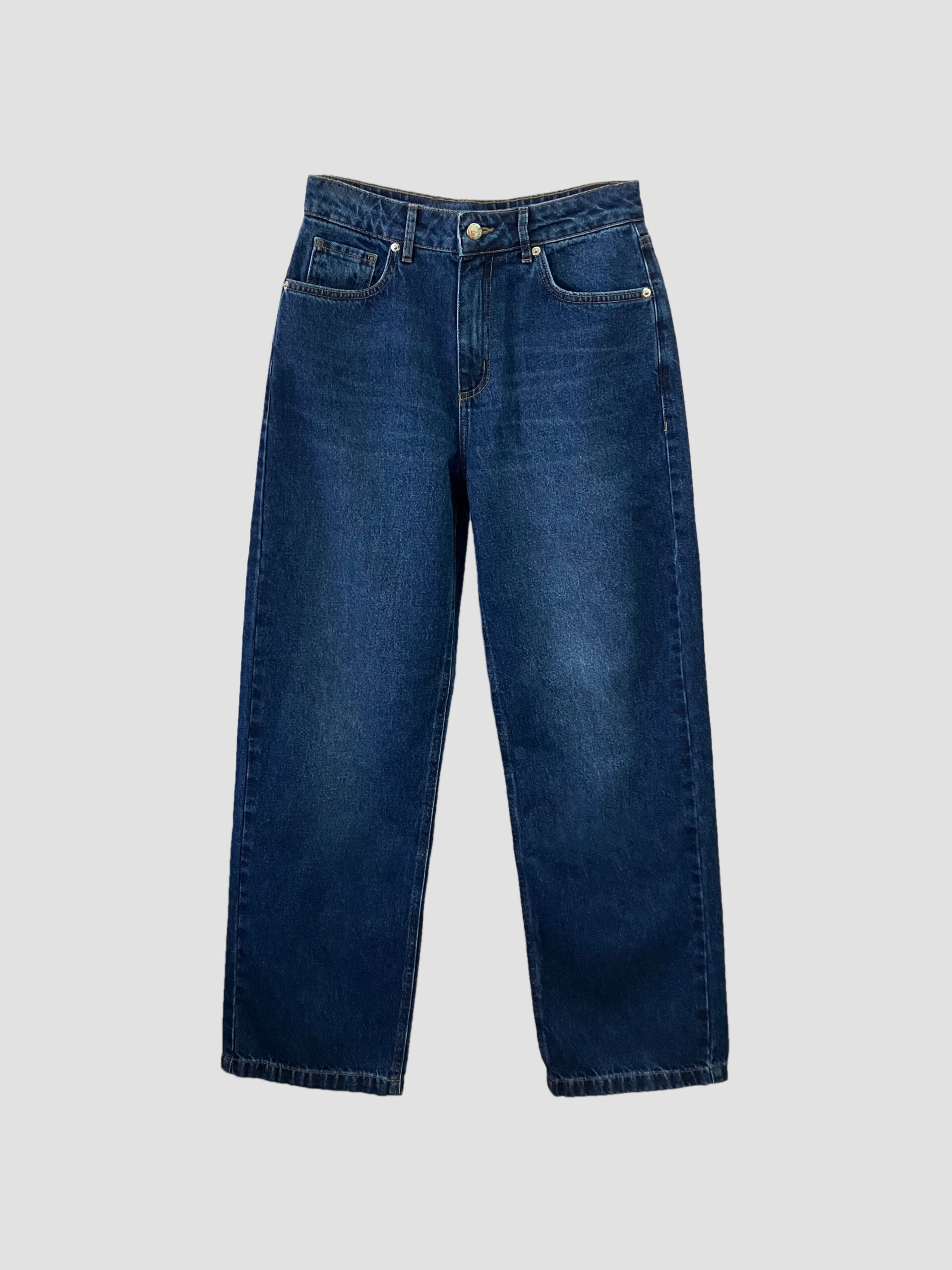 Jean recto relajado tiro medio con cinco bolsillos, cierre frontal y botón metálico. Lavado stone con bigotes.